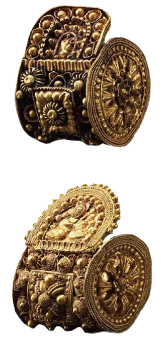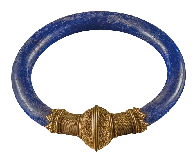 手镯由玻璃制成,并用黄金球形扣环固定,应当是富有女性的配饰。扣环饰以精致的金丝图样和小金珠。