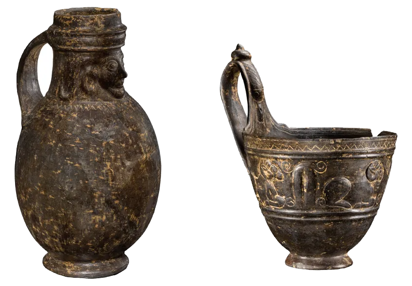 这组重型布凯罗器皿,是丘西和奥维托的典型陶器,这里的作坊专门制作厚壁器皿,饰以复杂、奢华的浮雕。陪葬品中原有约100件器皿,包括用来装酒的大安法拉盖罐、用来盛酒的凯索斯舀杯、用来倒酒的壶以及形状各异的酒杯。