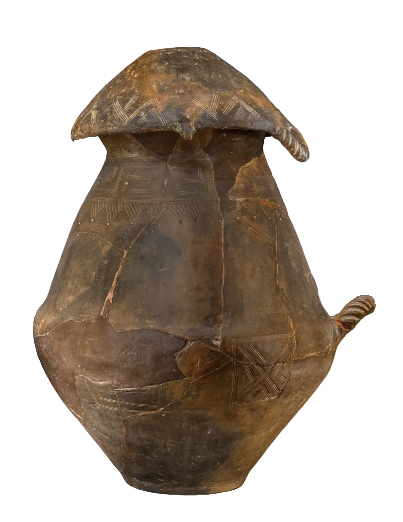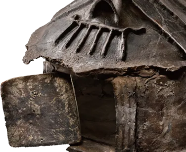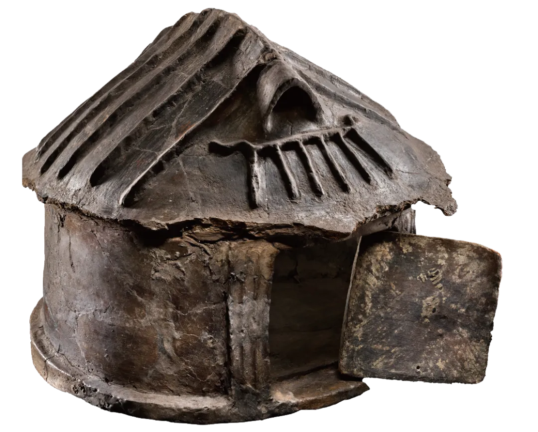 这类屋形骨灰瓮属于地位显赫的人物,表明他们家族首领的身份。将骨灰放在屋形骨灰瓮里的做法流传甚广,特别是在伊特鲁里亚南部和拉齐奥地区,从青铜时代开始,一直延续到铁器时代。这种造型也展现了最古老的房屋形式之一 —— 茅屋,其特点是椭圆形的建筑和覆盖着茅草的木梁结构,有时装饰有象征意义的雕塑,象征着对房子和居民的保护。