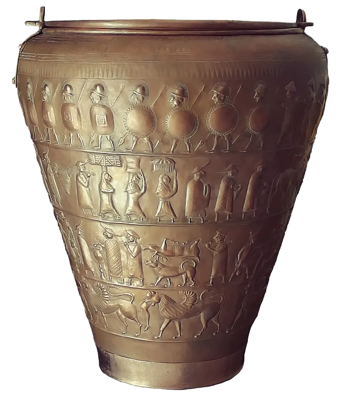 西图拉桶形器是一种截顶锥形容器,通常用来装水、牛奶或酒等液体。原件发现于博洛尼亚的切多萨墓地68号墓,被用作一位女性的骨灰瓮。它由一张青铜薄片向后折卷制成,用几颗小钉子固定,并装饰精美的浮雕,画面展现了一个复杂的民间仪式,是对伊特鲁里亚社会生活的再现。