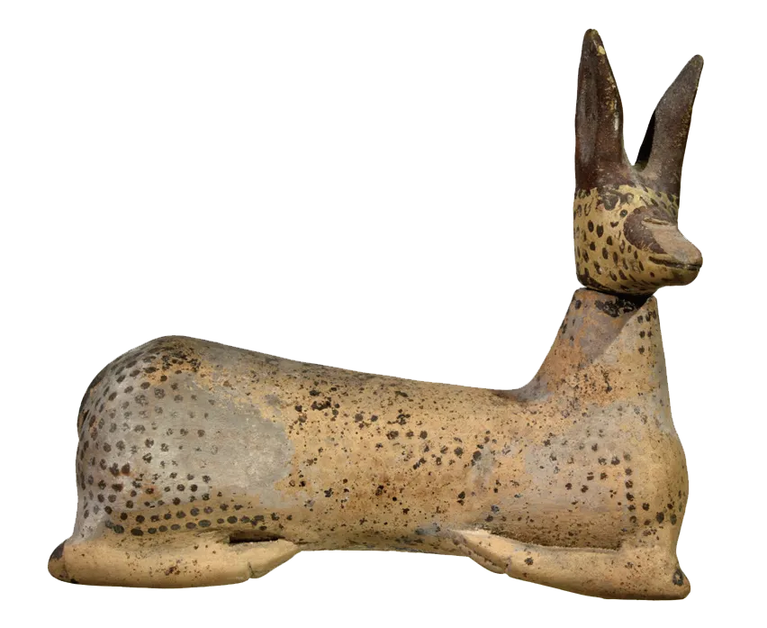 热爱生活的伊特鲁里亚人,十分重视个人护理。在奢华的伊特鲁里亚墓葬中,剃刀、镊子、昂贵的香水容器和镜子都有所发现。特别引人注目的是各式各样的香膏瓶。这个独特的香膏罐像一只蹲伏的小鹿,四肢蜷缩在身体下方。皮毛以棕色的小圆点呈现。头部可拆卸,用作密封罐的塞子。
