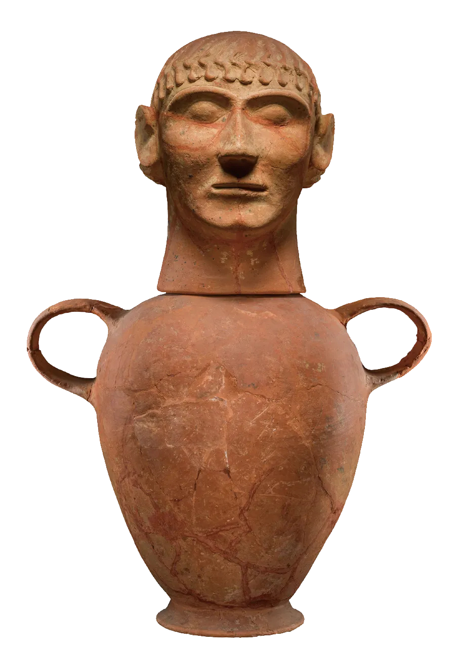 人形骨灰瓮通常发现于公元前7世纪至公元前6世纪早期的高级别墓葬中,目的是为了“复原”死者被火化的身体。这件展品的制作使用了最先进的方式,头部的造型虽采用了写实的风格,但不是对死者容貌的精确反映,而是一种写意化的再现。