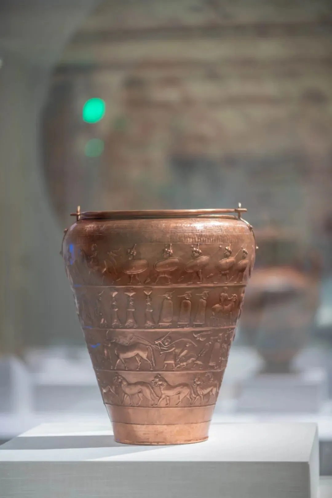 切多萨西图拉桶形器是博洛尼亚市立考古博物馆馆藏中最重要的文物之一,可以说是他们的镇馆之宝,因为无法出境,所以本次展览展出了按照伊特鲁里亚工艺进行制作的复制品。这件桶型器出土于博洛尼亚,在当时,博洛尼亚被称作菲尔辛纳,是伊特鲁里亚北方的一座重要城市。器表呈现了整个古代西方世界中最丰富、最详细的故事之一,刻画了士兵、贵族、平民进行不同活动的场景,以及人们想象中的冥界场景,完整反映了公元前6世纪伊特鲁里亚社会的风貌。