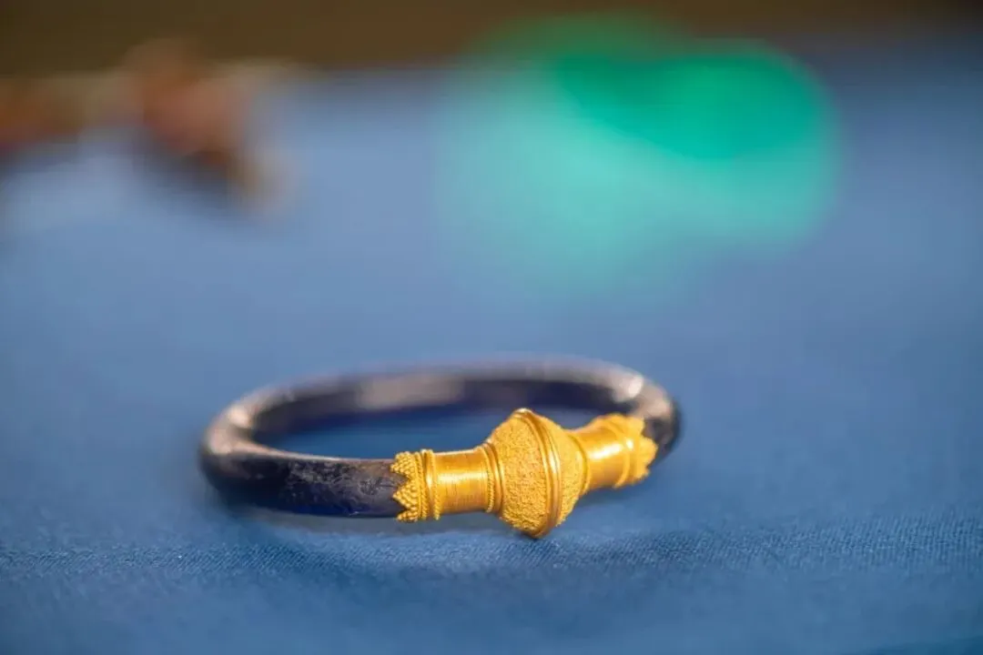 这两种高超技术在这只手镯上均有体现。手镯由蓝玻璃制成,用黄金扣环进行固定,扣环两边饰有精致的细丝和极小的金珠,通透的蓝玻璃配上华贵的黄金,流光溢彩,摄人心魄。