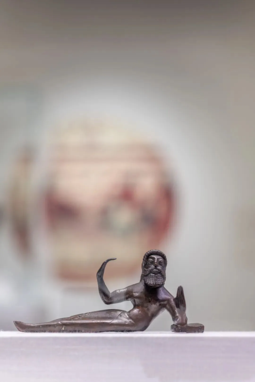 在展厅里,斜躺的人物形象随处可见,尤以这件赴宴人雕像最为生动。这些“躺平”的人其实是在参加宴会。在宴会上,人们往往斜躺在榻上,手臂弯曲以支撑身体,这位男士手肘下的垫子可能是为了让他在倚靠时更为舒适。