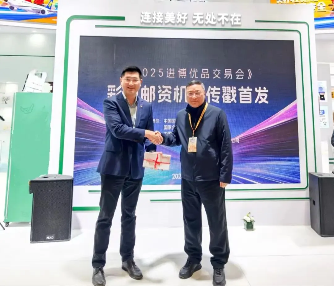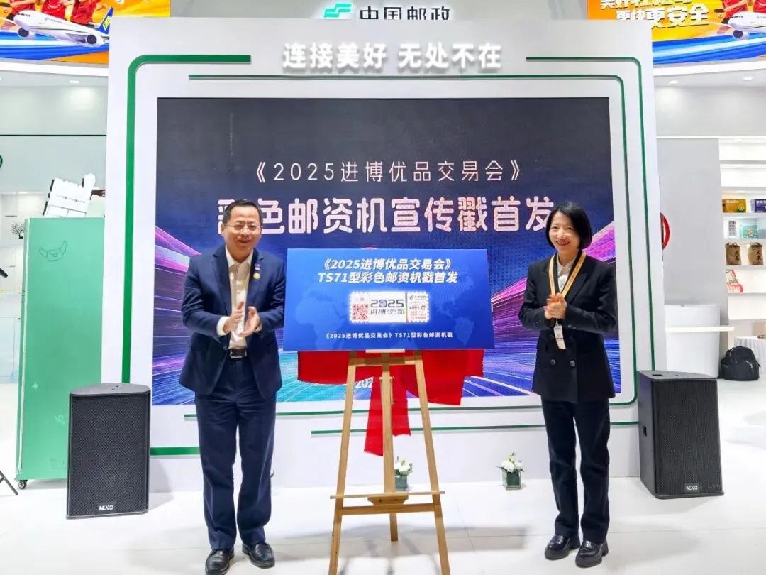 △中国国际进口博览局副局长、国家会展中心(上海)有限责任公司副总裁戈宏与市邮政分公司副总经理陆琰共同为《2025进博优品交易会》邮资机宣传戳揭幕