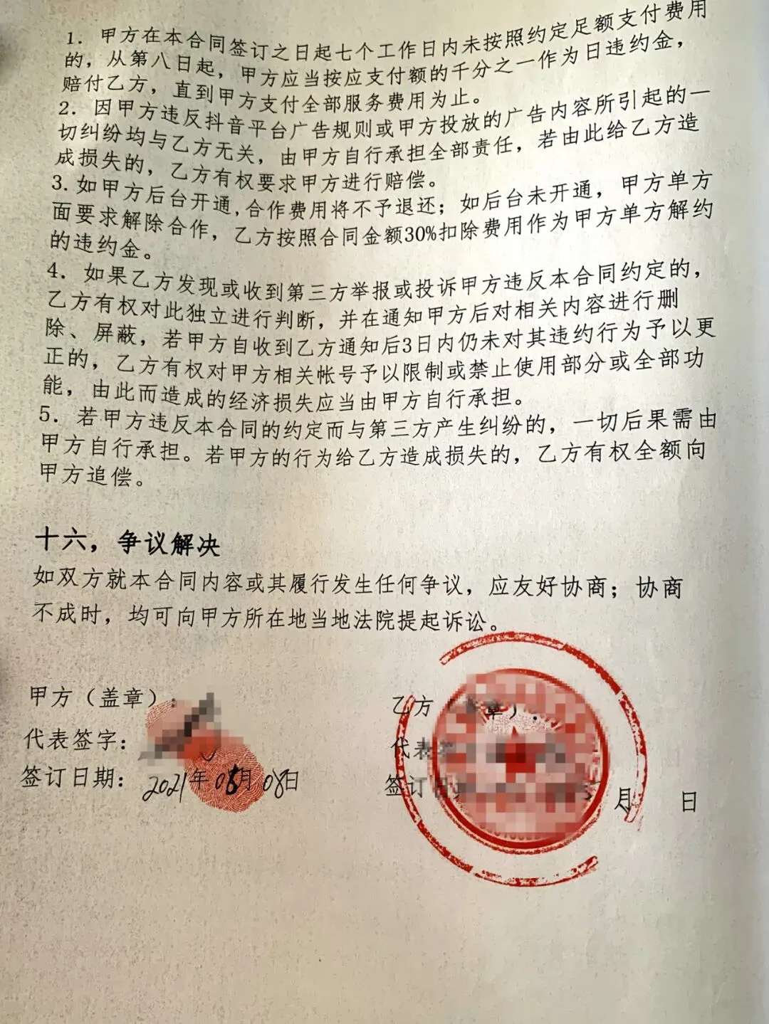 “首先,合同的乙方不是抖音所属公司字节跳动,合同里也没有任何关于抖音的内容和字样,连合同封面都写的是抖云商而不是抖音。”赵女士说,发现问题后她立即电话联系了抖音客服,得知并没有相关代理合作。
