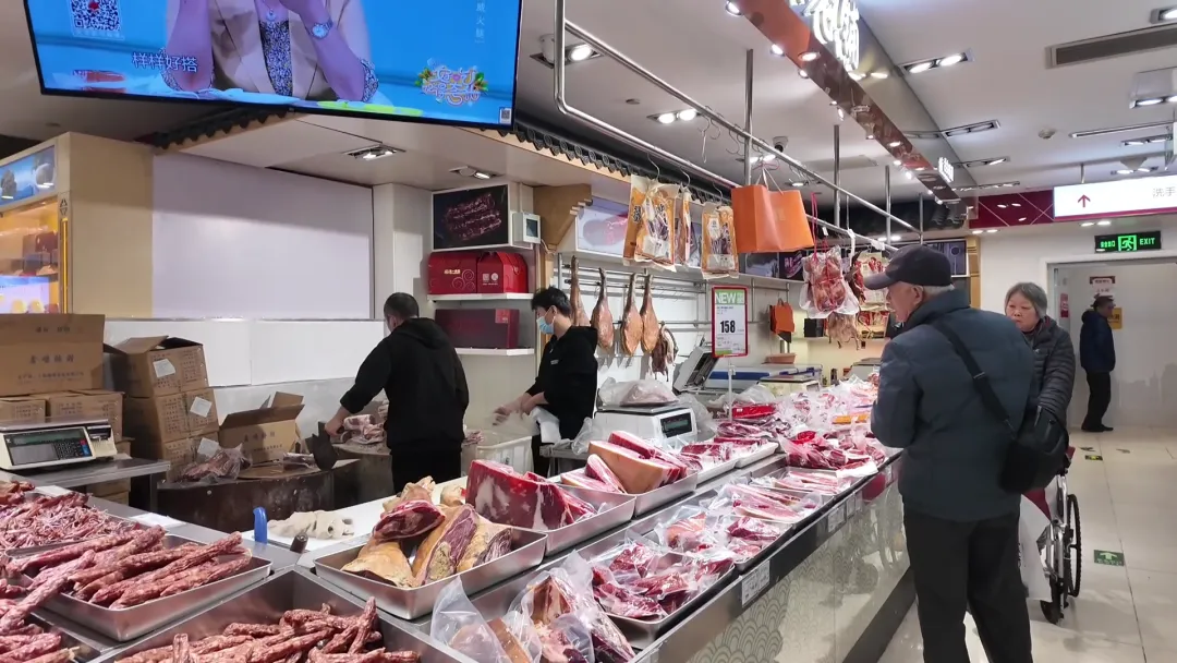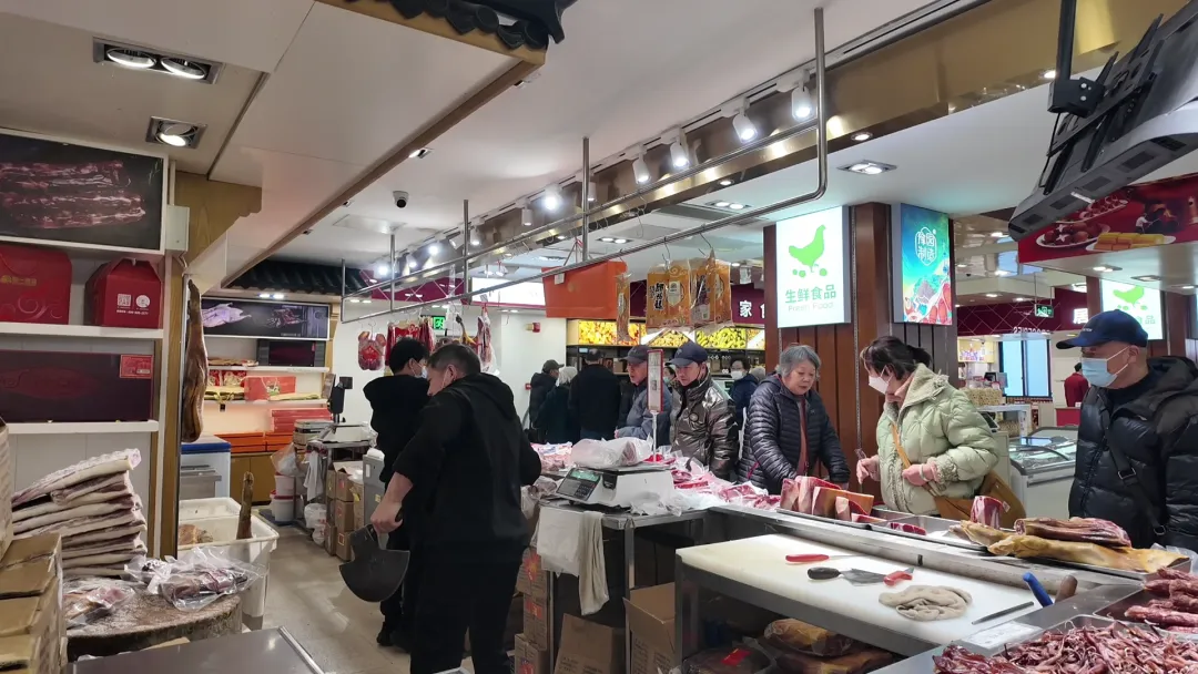 二楼的腌腊柜台前,产品琳琅满目,手工香肠、咸肉、酱油肉、风鸭腿等整齐地摆放着,散发着诱人的香气。市民们左顾右盼,仔细挑选着心仪的商品,一边琢磨着买些什么,一边已经在脑海中构思起了烹饪方法。一位正在挑选咸肉的张阿姨笑着说:“都说冬至大如年,这餐桌上肯定得有几道大菜。这咸肉用来烧腌笃鲜或者做咸肉菜饭,味道那叫一个绝,家里人都爱吃。”据工作人员介绍,像用来烧腌笃鲜或者做咸肉菜饭的咸肉,每天能卖到350斤左右;既可以清蒸又能入菜的手工香肠,每天销量也有两三百斤。