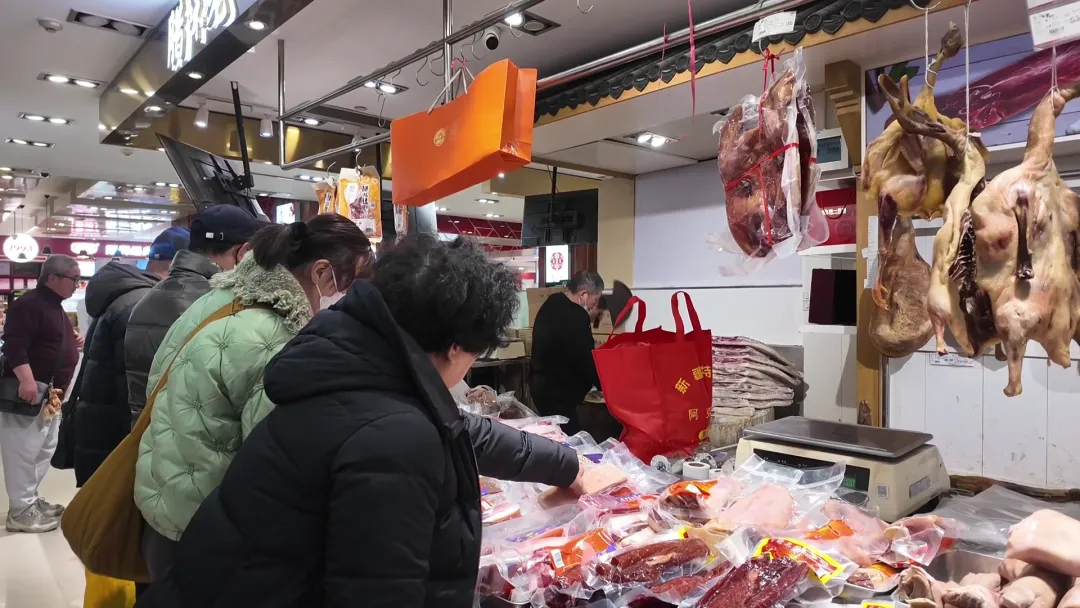 走进南京路食品商店,仿佛置身于一个热闹的采购盛会。几乎每个摊位前都围满了忙着选购的市民,他们有的手提大包小包,有的推着装满商品的小推车,在各个摊位间穿梭,一个个都收获满满。
