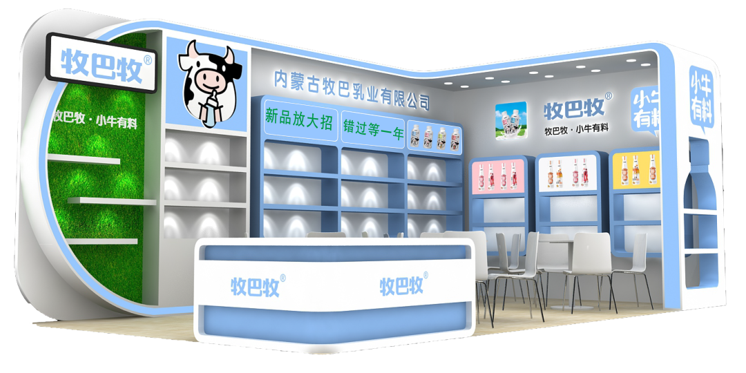 通体设计以白,蓝为主色调。让人有清新舒适的视觉效果。个性化的广告语“早上喝一瓶,营养更好喝”。让一整天充满活力。作为饮品行业的主打产品,为让客户有一个舒适的洽谈空间,在展位设计中设计了宽敞的会客区。力保每一位客户拥有舒适的体验感。