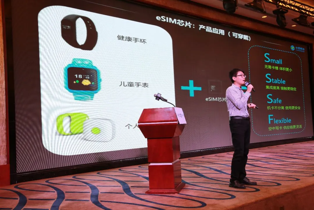 物联网公司集成电路创新中心市场拓展经理黄海鑫带来了《eSIM芯片致力打造智慧穿戴》的主题演讲,他说中国移动的芯片具有体积小、空中写卡供货周期短、低功耗、高稳定性、自动接入OneNET等特性。芯片产品覆盖了2G,4G及NB-IoT,预计今年出货600到1000万片,基于各类芯片的终端应用也非常丰富。其中自主研发的NB-IoT eSIM物联网通信芯片可以大幅降低功耗,提升设备续航,为智慧穿戴行业赋能更大价值。