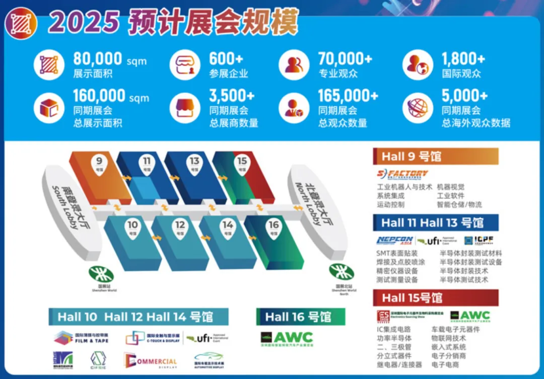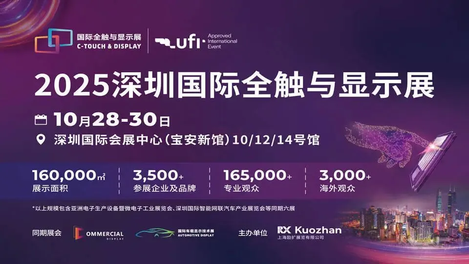 深圳国际全触与显示展将于2025年10月28-30日在深圳国际会展中心(宝安新馆)10&12&14号馆举办,作为智慧触控和新型显示行业的风向标展会,本届展会将联合COMMERCIAL DISPLAY深圳商用显示技术展、FILM & TAPE EXPO深圳国际薄膜与胶带展、AUTOMOTIVE WORLD CHINA 深圳国际智能网联汽车产业展览会、NEPCON ASIA亚洲电子生产设备暨微电子工业展览会等八展同期。16万平方米的超级展览盛宴,预计将吸引3,500多家展商及品牌齐聚现场,展示最新电子元器件生产及半导体封装测试工艺、新型显示及智慧触控制造、汽车电子技术、消费电子终端产品制造相关的最新材料及智能制造解决方案,一站式解决您的采购、技术交流、商务拓展的需求。