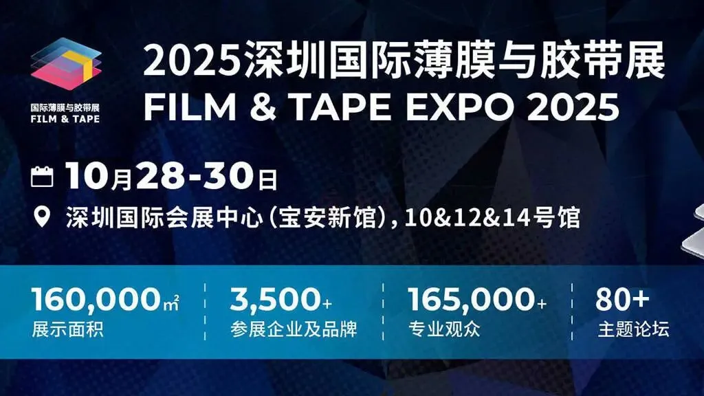 深圳国际薄膜与胶带展(FILM & TAPE EXPO)将于2025年10月28日-30日在深圳国际会展中心(宝安新馆)举办,作为薄膜胶带与涂布模切领域的风向标展会,本届展会将联合深圳国际全触与显示展、亚洲电子生产设备暨微电子工业展、深圳国际智能网联汽车产业展览会、深圳电子元器件及物料采购展览会、智能工厂及自动化技术展览会等多展同期。超14万平方米的超级展览盛宴,规模空前,预计吸引160,000名行业优质买家到场。