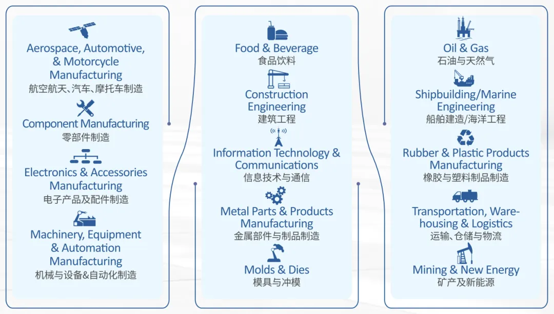 东南亚是全球最具活力的增长市场之一,产业特色鲜明。泰国作为"亚洲底特律",汽车与电子制造业发达,对机床,零配件需求旺盛;越南90%的机械设备依赖进口,市场空间广阔;新加坡则聚焦高附加值研发与技术创新。展会深度覆盖电子制造,汽车,食品加工等核心产业及橡胶,塑料等特色基础领域。