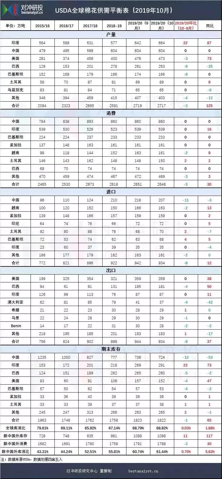 1. 中美贸易现状没有变化,全球需求也没有实质性改善,改变的是市场情绪中美磋商第一阶段进展,维持中美贸易现状,不再继续恶化,但也没有变好,没有降低或取消已加征的关税,仅仅是推迟了计划于10月15日对2500亿美元进口加征关税;至于第二阶段谈成什么样还需要更多时间;所以无论所有涉及中美贸易商品所受到的影响没有改变,中国出口需求没有改善,受其影响所涉及的需求、就业与预期收入没有改善。按照外媒说法,中美磋商第一阶段取得实质性进展在经过4-5周后形成文本并签署后,中美就启动第二阶段磋商,这是改变了市场对中美关系发展的预期,起码不再恶化并变化向好,市场情绪高涨。在这个过程还是需要较长时间磋商,市场也将不断从高涨情绪中回归宏观经济现实。所以宏观经济实质性转好才是最终出路。全球经济发展依然存在不确定性,全球棉花消费也存在进一步下调的可能,此次10月USDA调高全球棉花消费量以及印度棉花消费量是存疑的,包括维持中国棉花消费量860万吨预测,与真实消费量还存在至少60万吨下调空间;全球产量同比增加125万吨,美棉产量同比增加73万吨,采购50万吨全球棉花依然过剩,但如果采购100万吨,那也将维持上个年度全球平衡表。如果国储大量采购美棉,这导致地区均衡大幅改变。2019/2020年度美棉增产73万吨,期末库存增加50万吨,又面临全球需求疲软,出口销售压力很大,如果国储大规模采购美棉,将大幅减轻美棉供给压力。而对中国而言,本身存在消费缺口,依然需要进口弥补国内供给不足,但是中国国内下游棉花需求差,加上中国储备抛售,并且价格优势明显,这使得国内供给充足,对棉花进口依赖程度下降,即不需要进口过多棉花。问题是中国储备棉花历经四年抛售,库存量已大幅下降,存在轮入需求。对于国储轮入计划量是50、100、150还是更多,目前市场无法预知。但如果准备轮入50或100万吨,并决定大量采购美棉并轮入储备,那么轮入新疆棉概率或预期量都会降低。同时,国内本身就缺少棉花,轮入国内棉花导致国内棉花大幅上涨,这样损害纺织厂原料成本竞争优势进而影响就业。04