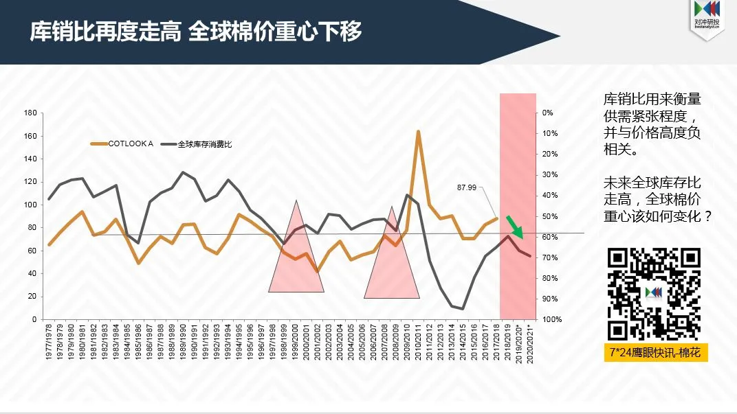 由于产量增产,消费需求弱,全球供给过剩的大格局没有改善的情况下,除非全球经济走势转好,消费需求改善,尽管有利好出现,全球棉价会出现大幅反弹,但很难有大幅上涨的趋势;而由于美棉种植成本支撑、中美磋商取得实质性进展,预期中国大量采购美棉,改变美国以中国以外地区的供需关系,美棉价格将出现大幅反弹,其实近期美棉从底部已经反弹13%,下周一会延续继续反弹,并且市场维持了一段时间与中国棉价的倒挂。至于美棉价格能涨多高,还要看全球棉花消费是否得到真实改善。中国棉价则要面临上个年度大量期末结转库存,而下游需求依然孱弱,加上新棉大量集中上市,加之预期国储大量轮入美棉,中国市场未来棉花供给将十分充足,所以中国纺织厂采购依然谨慎,但短期内新棉籽棉集中收购期会出现抢购,收购成本上升,美棉大幅反弹带动,国内棉价也会有出现反弹,但是面对年度供给充裕的格局依然难以有一个十分有想象力的上涨空间。通过以上分析,国储大量采购美棉,改变地区供需平衡,利多美棉,利空中国,导致棉价外强内弱,短期内内外棉花价差倒挂将维持一段时间,甚至扩大,但是从长期看,国内棉价与外棉价差持续的倒挂,中国以外地区棉纱用棉成本将失去竞争力,中国势必继续减少棉纱进口,从而抑制中国外地区棉花消费需求。无论从长期看还是从历史看,内外价差倒挂不可长期持续,终将回归一个合理的区间。待市场高涨情绪退去后,最终要回归基本面的现实,只有全球消费需求实质性改善,才能真正改变全球供需平衡格局。监控棉花策略背后的逻辑、数据、信息变化,请订阅鹰眼快讯·棉花Pro