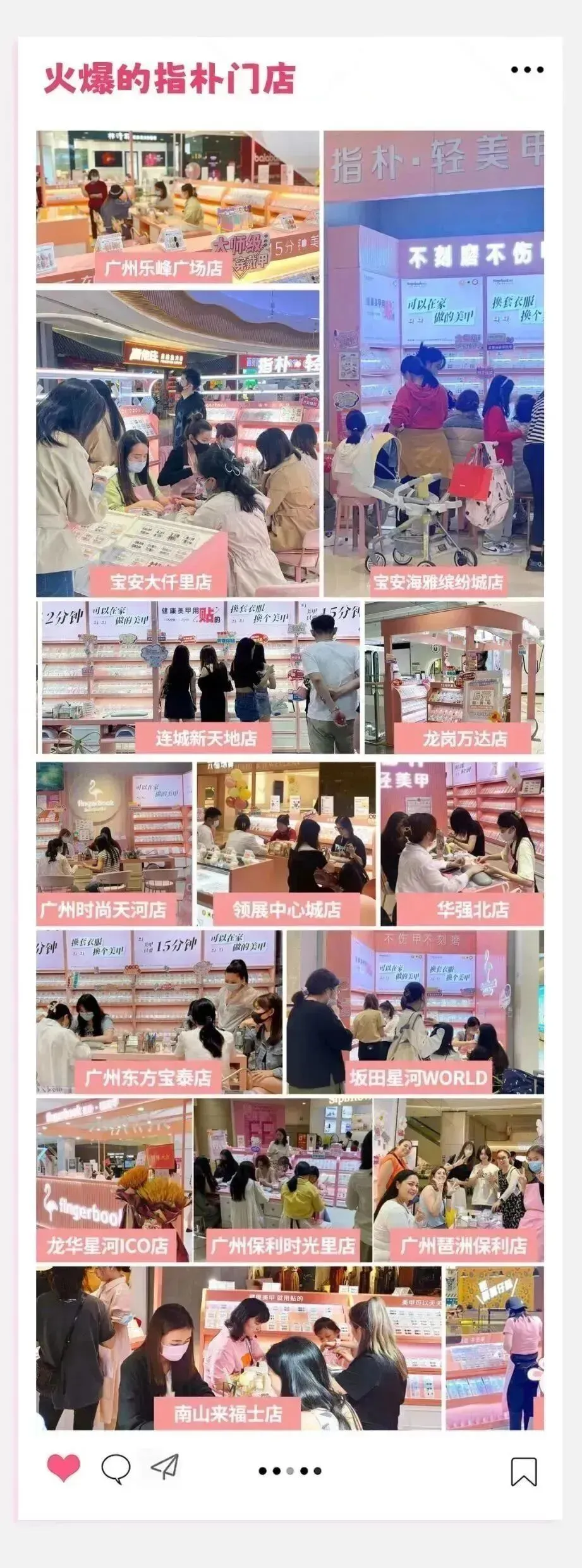 指朴是国内轻美甲连锁领导品牌,过往开过150家加盟店和50家直营店,目前已进驻全国各大城市的地标性商场。