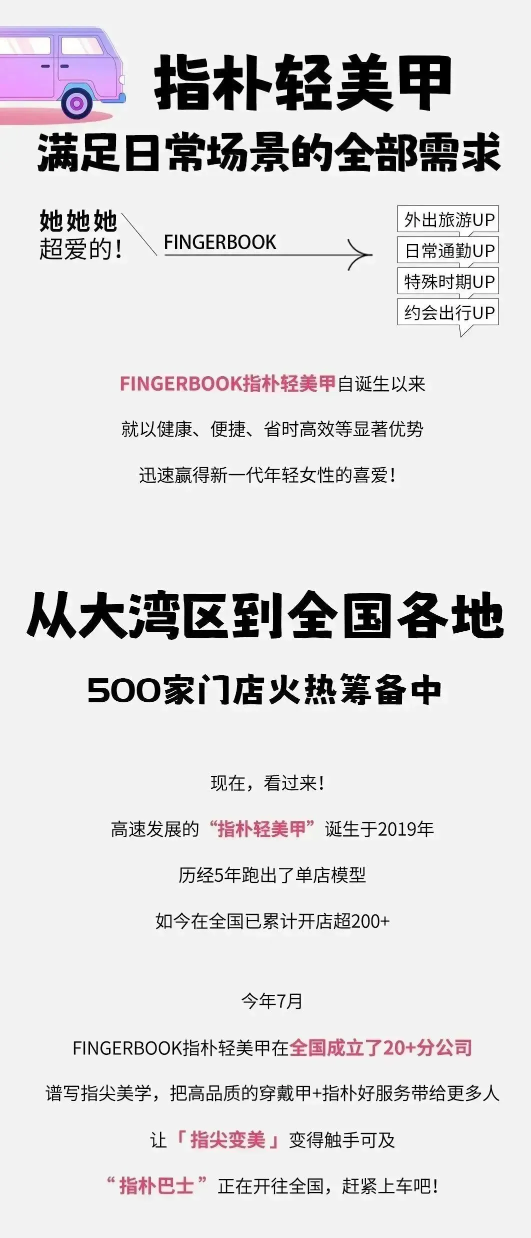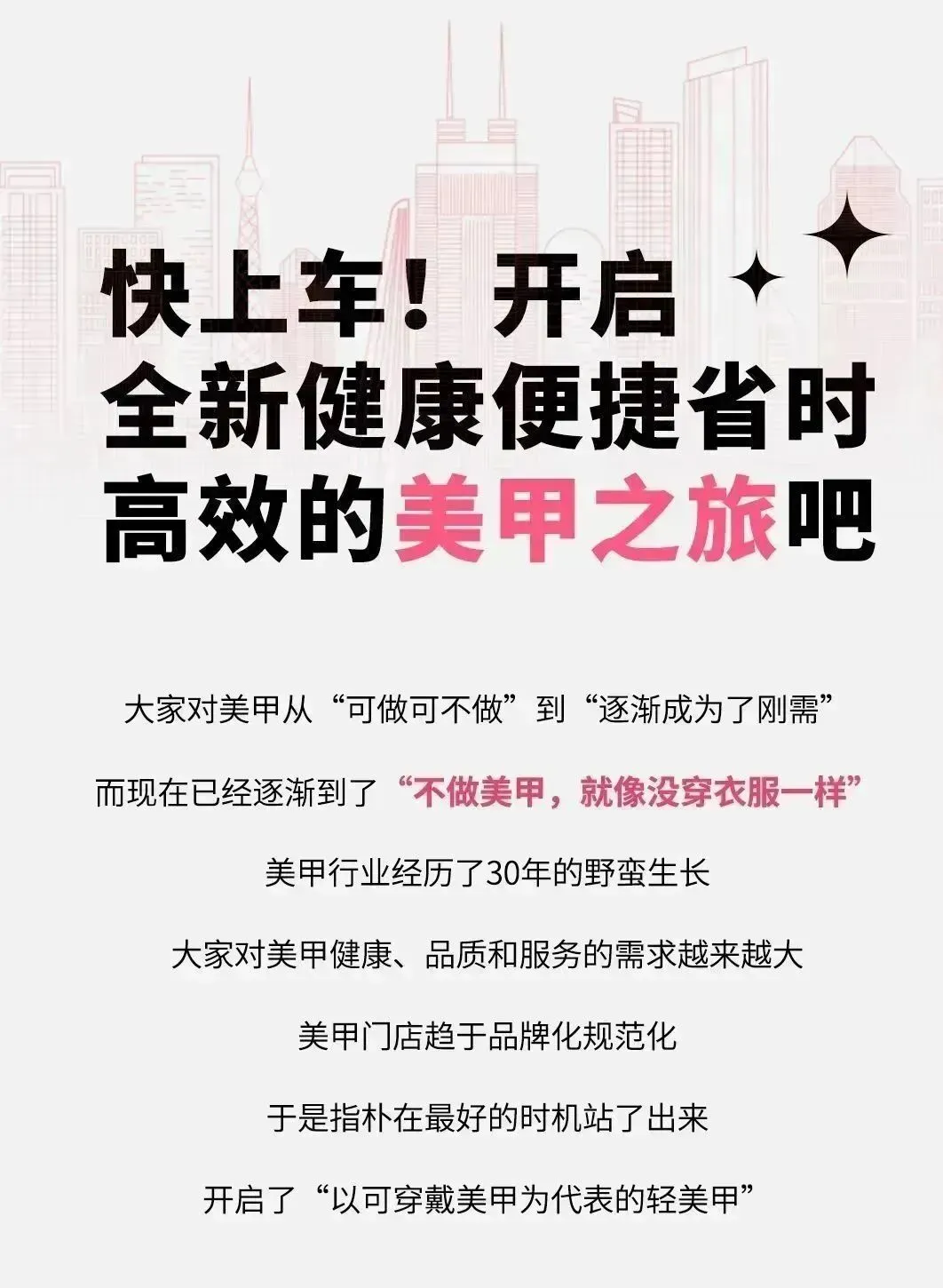 指朴是将美甲行业品牌化、规范化的领头羊,是轻美甲连锁品牌的领导者,它开启了全新赛道——以可穿戴美甲为代表的轻美甲。指朴是轻美甲赛道的唯一开创者!