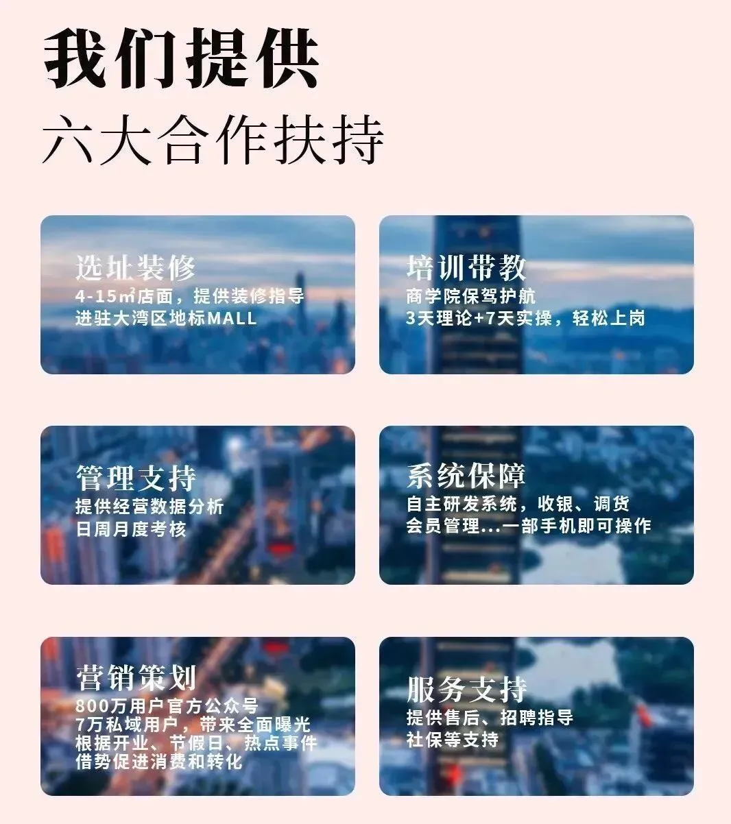 我们帮你选址装修: 4-15㎡的店面都能开指朴小店,我们有专业的选址团队为您指导; 我们帮你培训带教: 指朴商学院保驾护航,3天理论+7天实操,助力轻松上岗; 我们提供管理支持: 提供经营数据分析,顾问下店指导; 我们提供系统保障: 自主研发系统,一部手机完成收银、调货、会员管理等操作; 我们提供营销策划: 800万用户官方公众号、10万+私域用户为您带来全面曝光,更有品牌活动促进消费和转化。