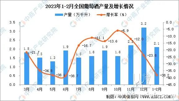 2023年1-2月全国葡萄酒增长情况: