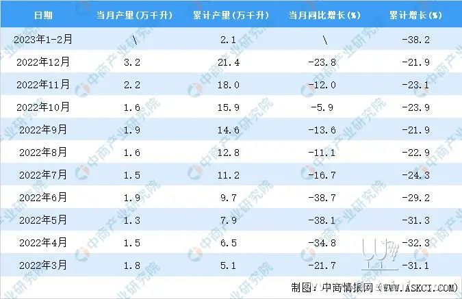据中商产业研究院数据库显示,2023年1-2月全国葡萄酒产量与去年同期相比下降。2023年1-2月全国葡萄酒产量为2.1万千升,同比下降38.2%。