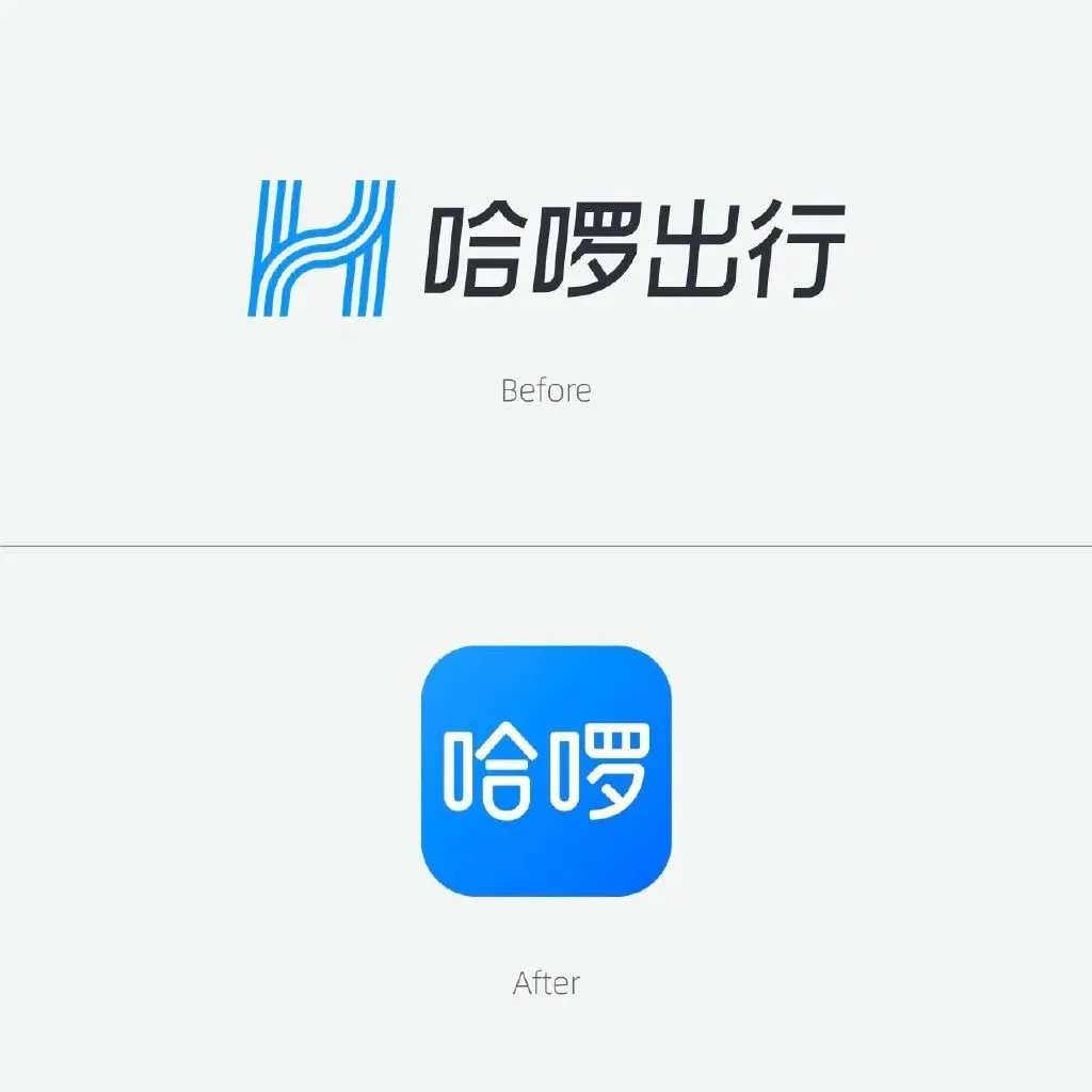4月25日,哈啰出行宣布品牌升级并更换LOGO。新LOGO去掉了图形“H”,直接采用“哈啰”两字,品牌色“哈啰蓝”饱和度也进一步提高。字体LOGO加入了“开口笑”的理念,“口”字部分加入模仿笑脸的弧形设计,表现哈啰“陪伴生活每一天”的贴心品牌理念。