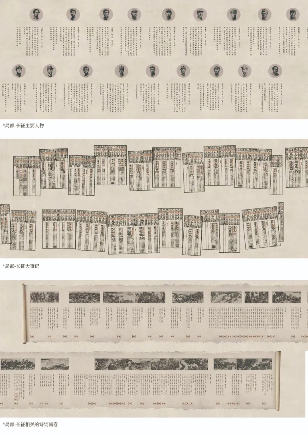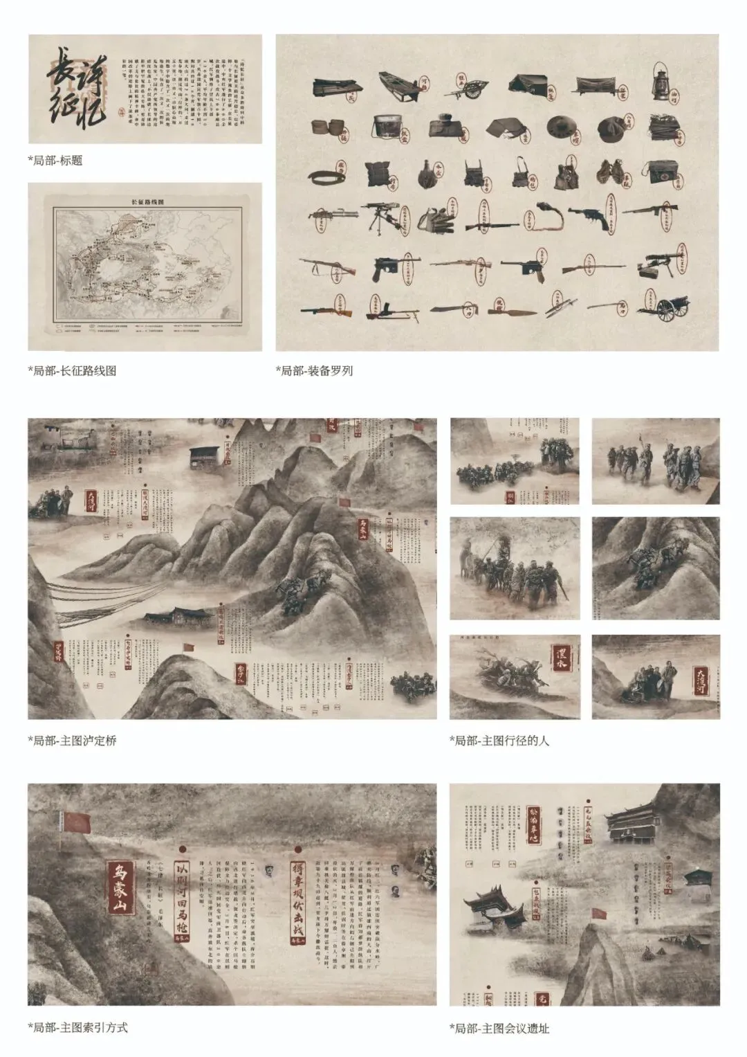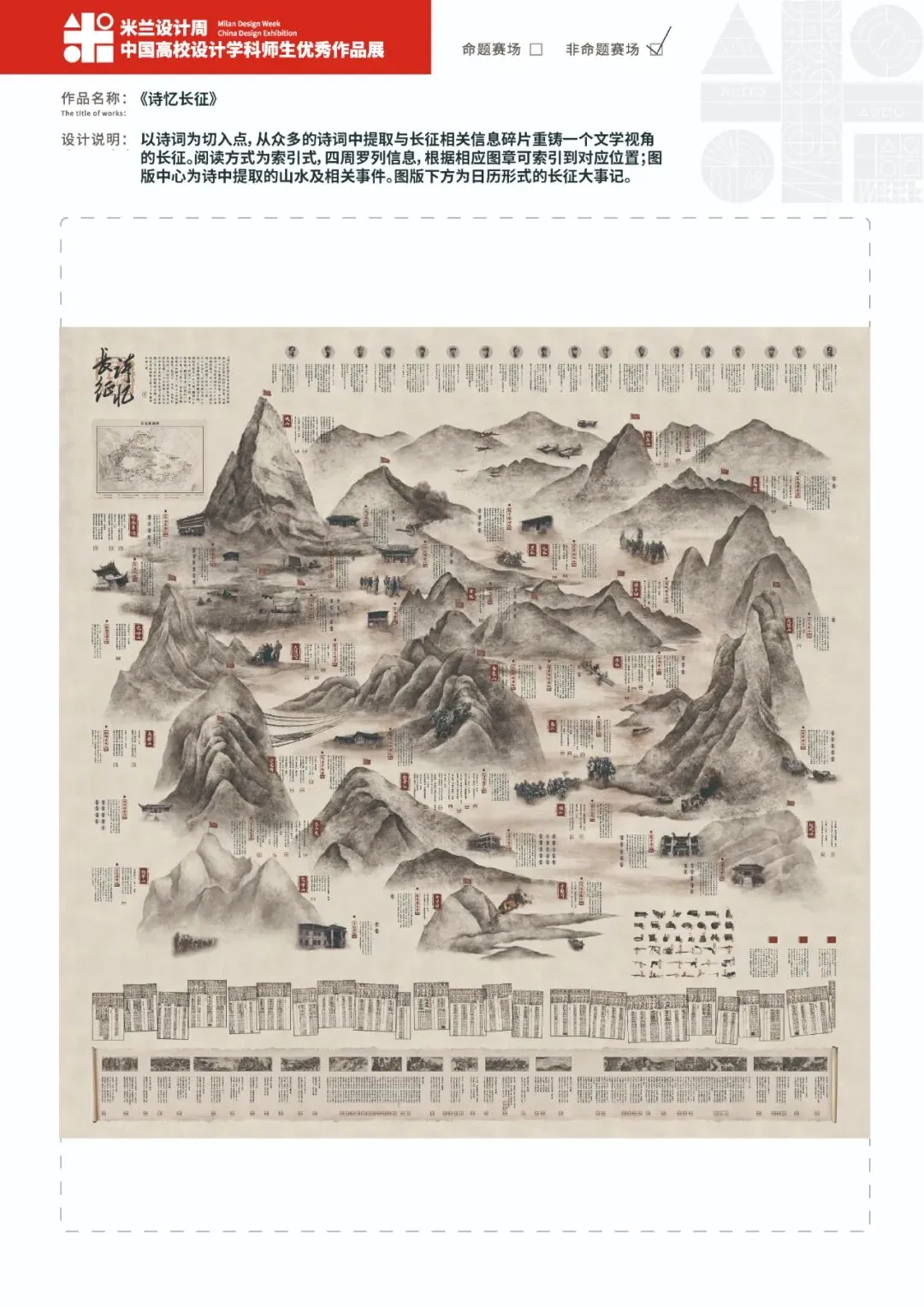 以诗词为切入点,从众多的诗词中提取与长征相关的信息碎片,以重铸一个文学视角的长征。该图版阅读方式为索引式多新四因为信息的零列分别为领导人物,诗表料相应的图营均可索引到对应位置:图后中心为诗费中提取的山与水并讲对应的相事件。图版下方为日历形式的长征大事记。记录事件发生的时间、地点、人物、主要内容及意义,并根据本月事件的重要程度进行上下排列。