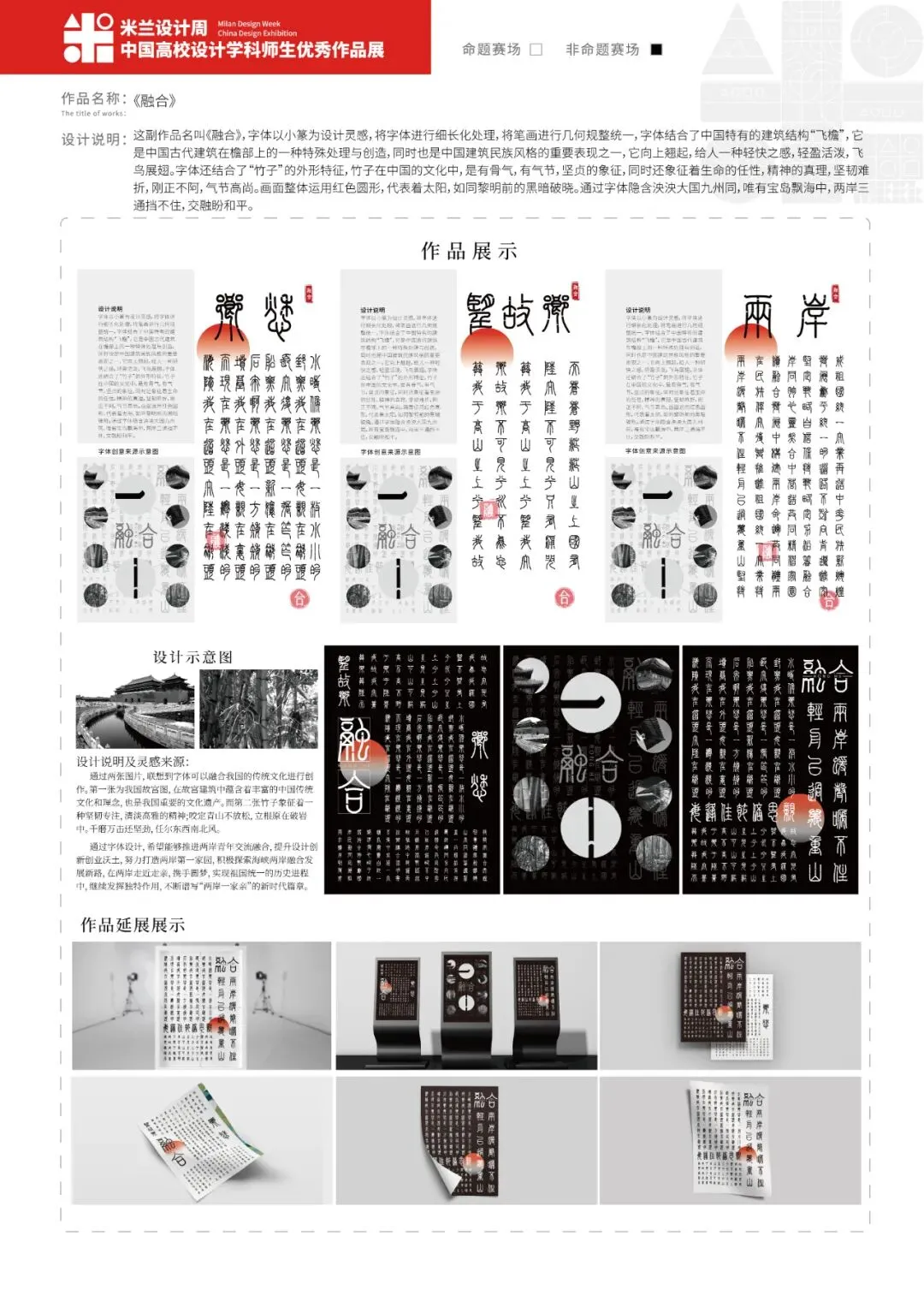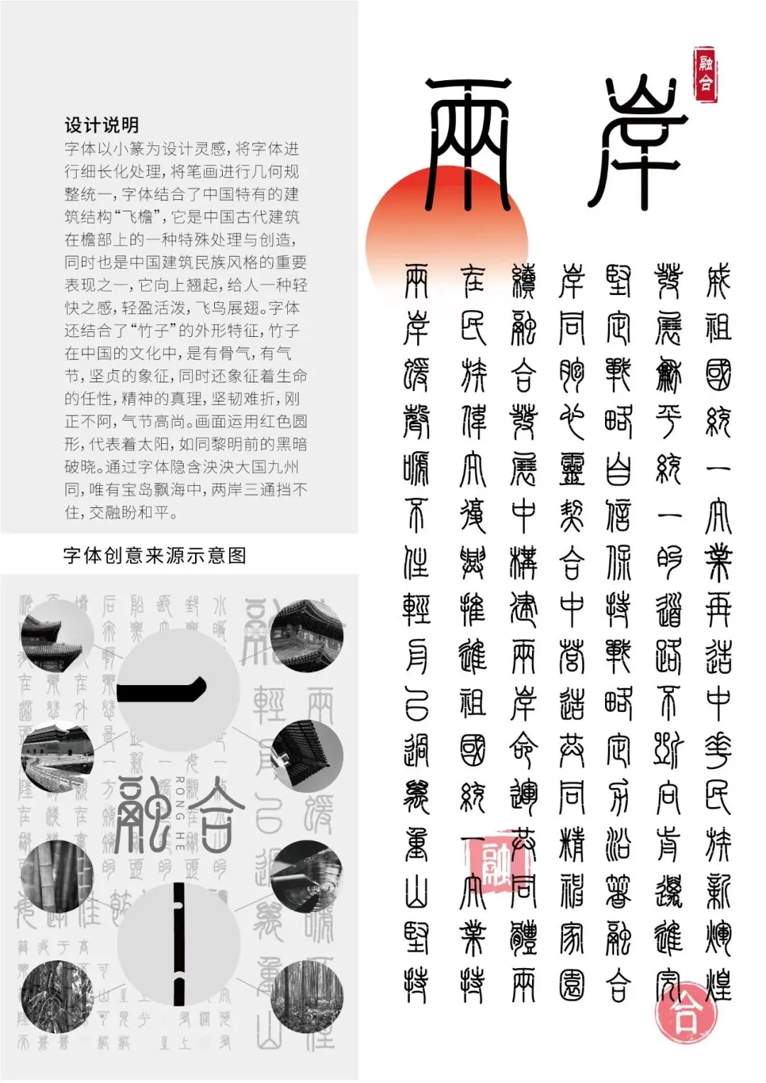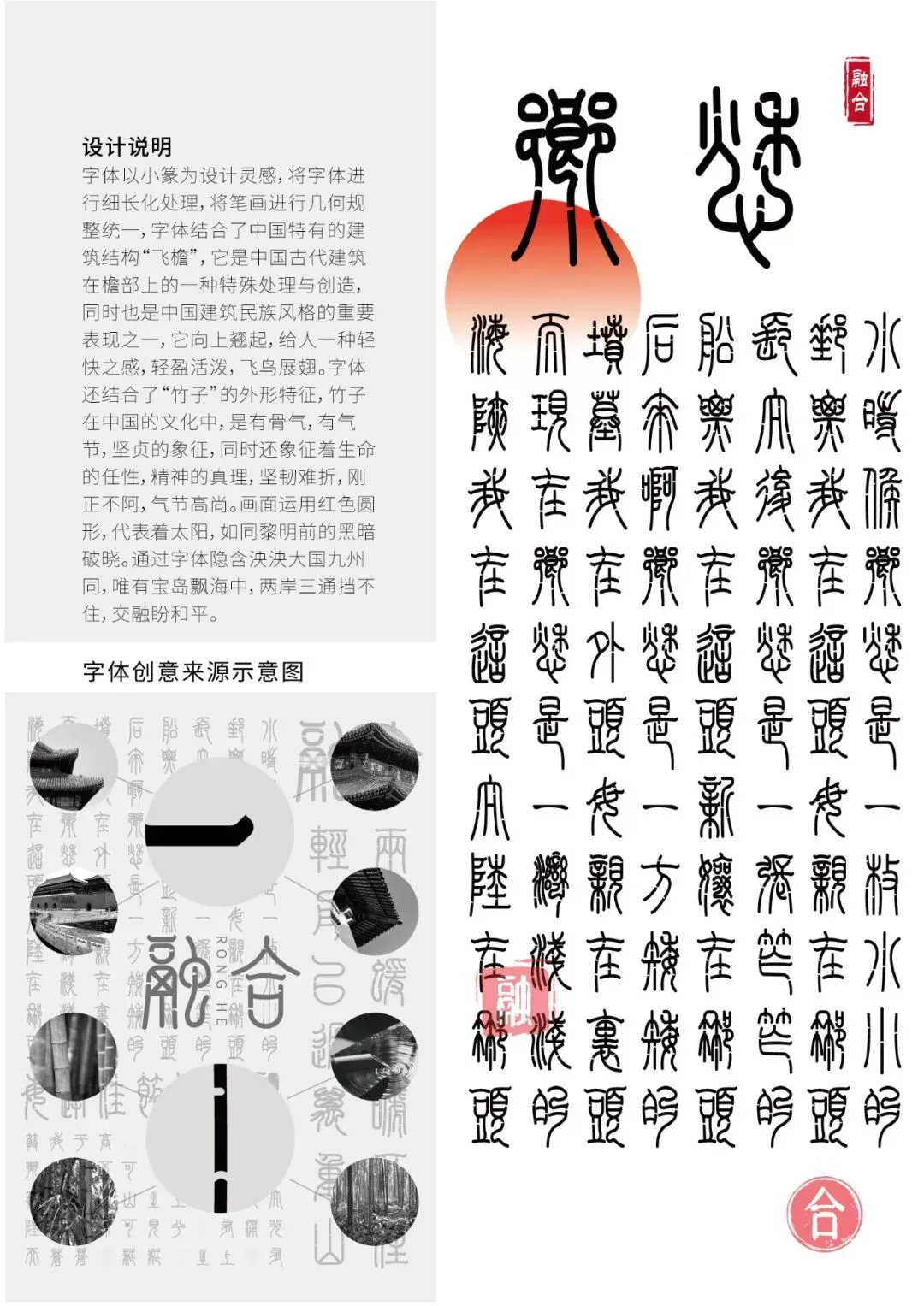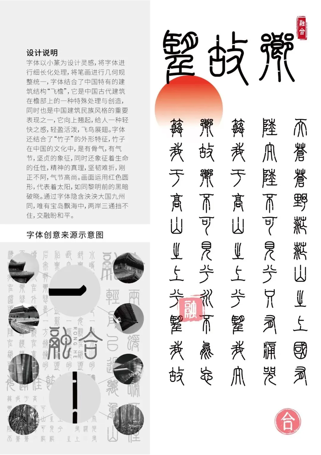 字体以小篆为设计灵感,将字体进行细长化处理,将笔画进行几何规整统一,字体结合了中国特有的建筑结构“飞檐”,它是中国古代建筑在檐部上的一种特殊处理与创造,同时也是中国建筑民族风格的重要表现之一,它向上翘起,给人一种轻快之感,轻盈活泼,飞鸟展翅。字体还结合了“竹子”的外形特征,竹子在中国的文化中,是有骨气,有气节,坚贞的象征,同时还象征着生命的任性,精神的真理,坚韧难折,刚正不阿,气节高尚。画面整体运用红色圆形,代表着太阳,如同黎明前的黑暗破晓。通过字体隐含泱泱大国九州同,唯有宝岛飘海中。