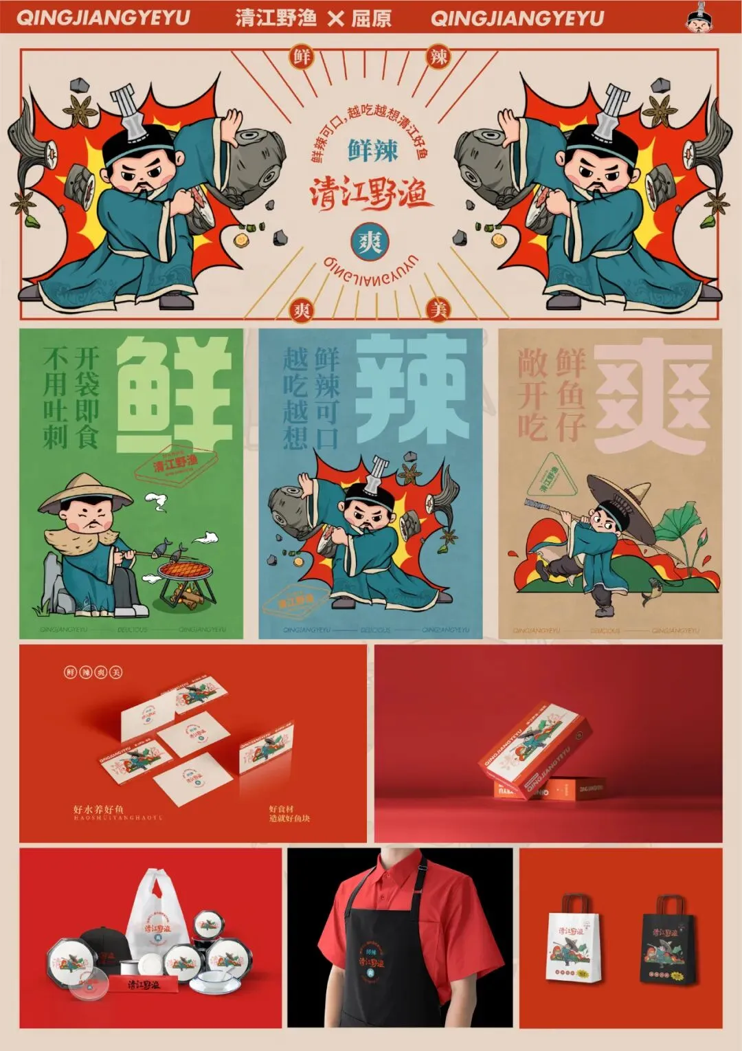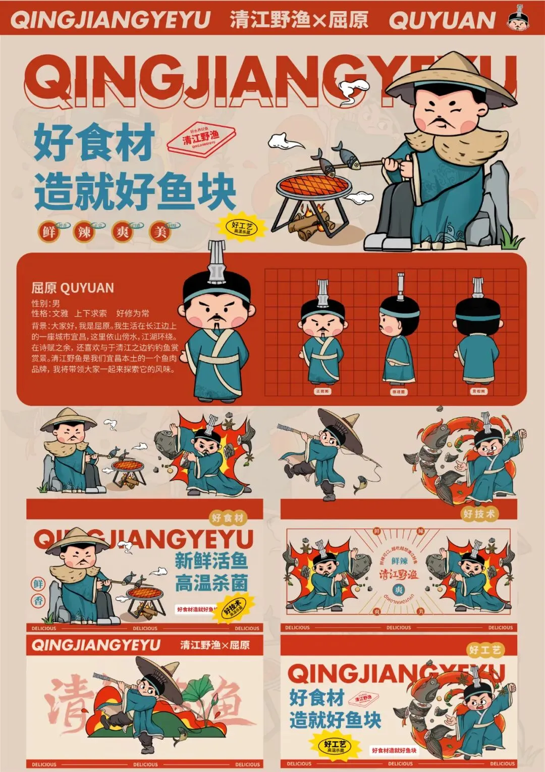 屈原×清江野鱼品牌设计,将屈原ip结合宜昌本土鱼肉品牌—清江野渔进行联名设计,融合创新,将屈原Q版化,动态场景结合清江野渔独特、科学的制作过程,通过个性化肢体动态语言的表达传播清江野渔的鱼仔从捕鱼、烤鱼到最终熬制的精细过程,展现品牌独特的口感与风味。