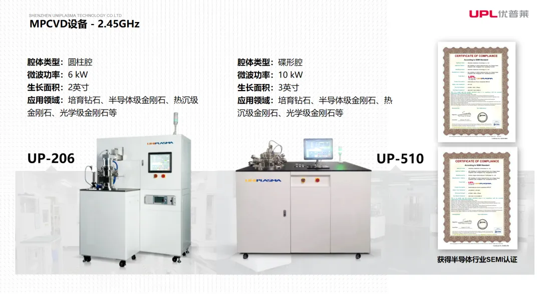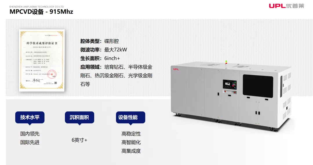 在核心产品端,优普莱通过自研MPCVD设备以降低进口依赖,先后推出6KW圆柱腔(UP-206)和10KW碟形腔MPCVD(UP-510)设备产品。2022年,为实现大尺寸金刚石稳定高效生长,直击市场对大功率、大尺寸的核心需求,公司正式推出915Mhz大功率MPCVD设备,成为国内首家实现批量出货915MHz MPCVD设备的企业,适用于多种单晶与多晶金刚石制备,可支持大面积金刚石材料生长。目前,915MHz MPCVD设备已历经多次迭代,并经权威认证:整体技术国内领先,部分指标国际先进。