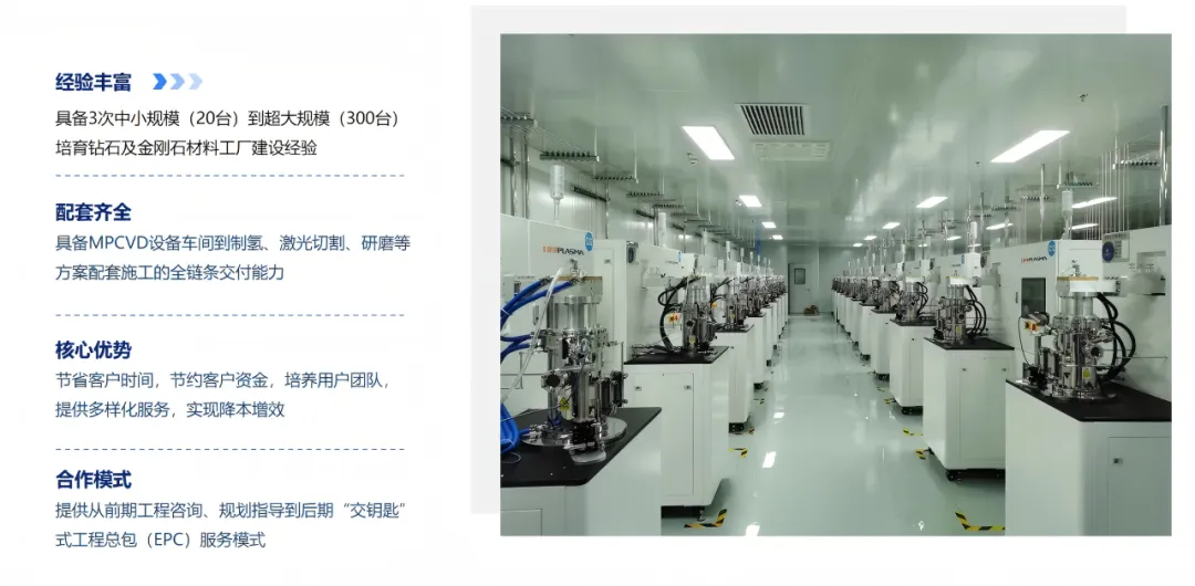优普莱前后完成三次建厂服务项目,具备从小规模实验室到大规模金刚石材料工厂的建设经验,可提供从前期工程咨询、规划指导到后期“交钥匙”式工程总包(EPC)服务模式,让客户实现“拎包入住”。