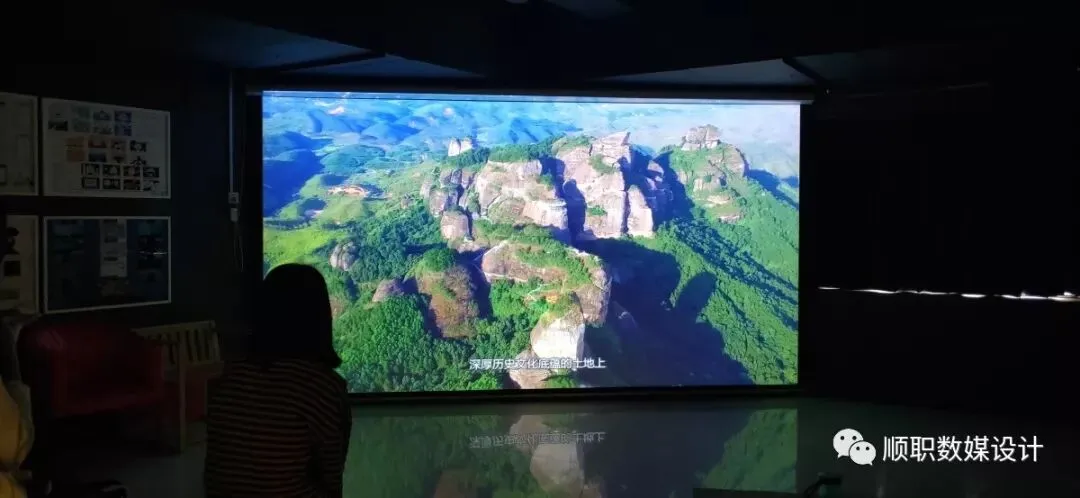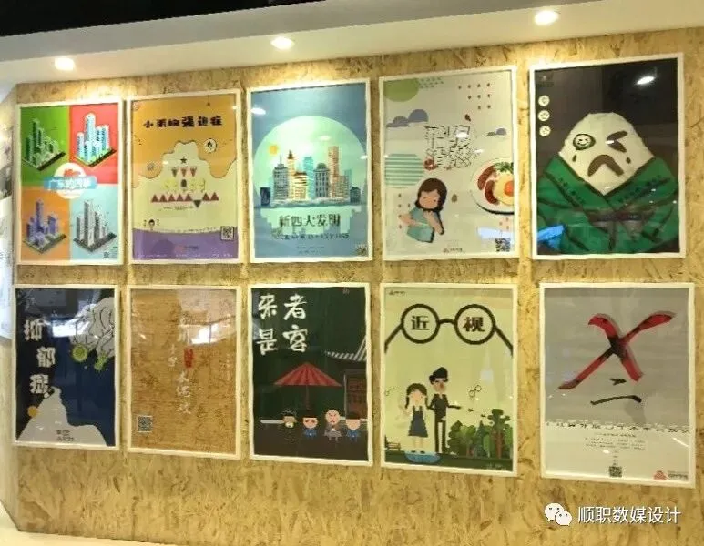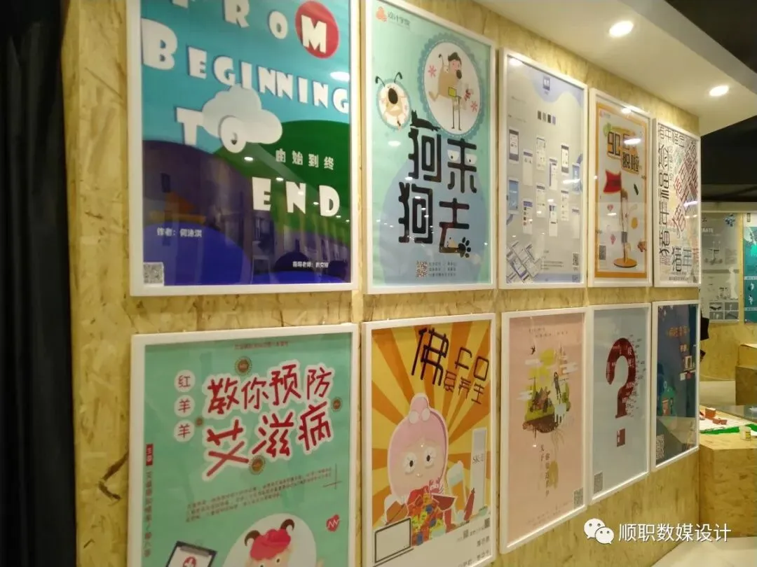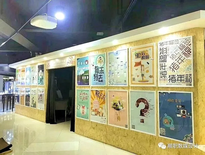 数媒专属小黑屋,外面是很好看的作品海报,里面是视频播放,动静结合十分OK。在这多元化的信息时代里,用书用文字来传递知识信息已经远远满足不了人们了,现在人们对动态的信息远远比静态的感兴趣,所以三维动画、MG动画、动态海报、影视短片等动画在网络占的比例越来越重,数媒专业在这个时候就发挥很大的作用了。