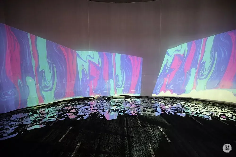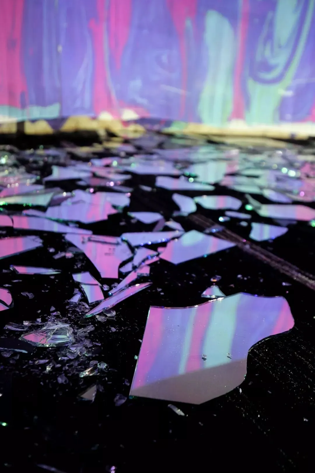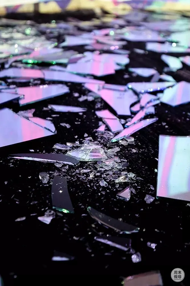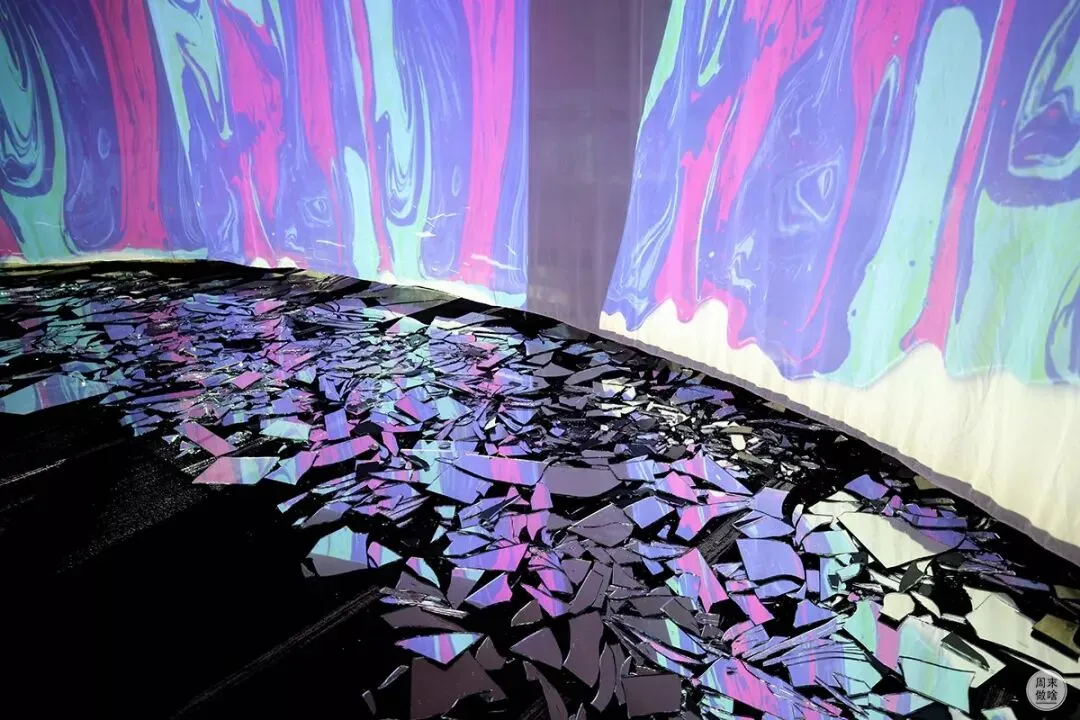 伴随着现场的音乐声,艺术家打碎布置的玻璃地以及有着彩色油墨般投影印记的布料,散发出一种十分迷离但又梦幻的感觉。小怪感觉,完全可以坐在这里的地上完成一次冥想。