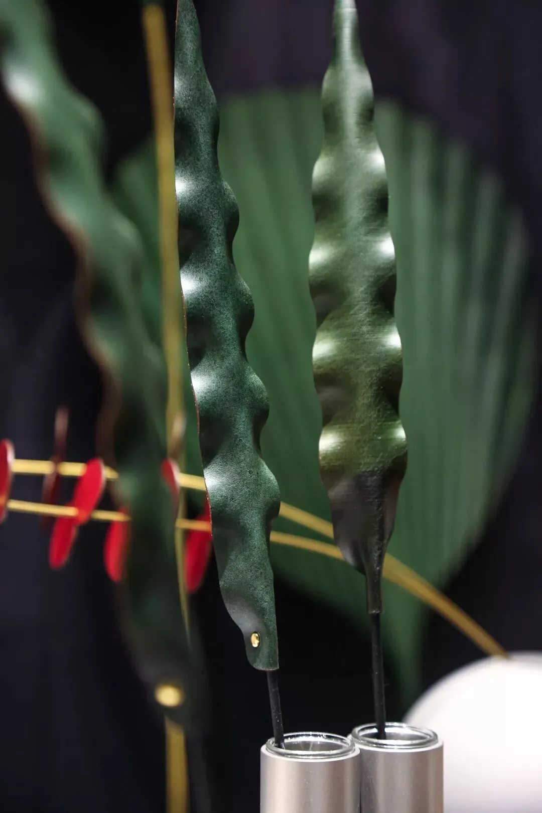 虽然现在外面已经有很多皮革的工作室,但是葉葉的完全不同,他们自己开发了独特皮塑技术揉合植物与皮革,打造保有叶面纹理与叶身质地的皮塑工艺,以皮革的柔韧重新诠释了台湾原生植物的轮廓与姿态。