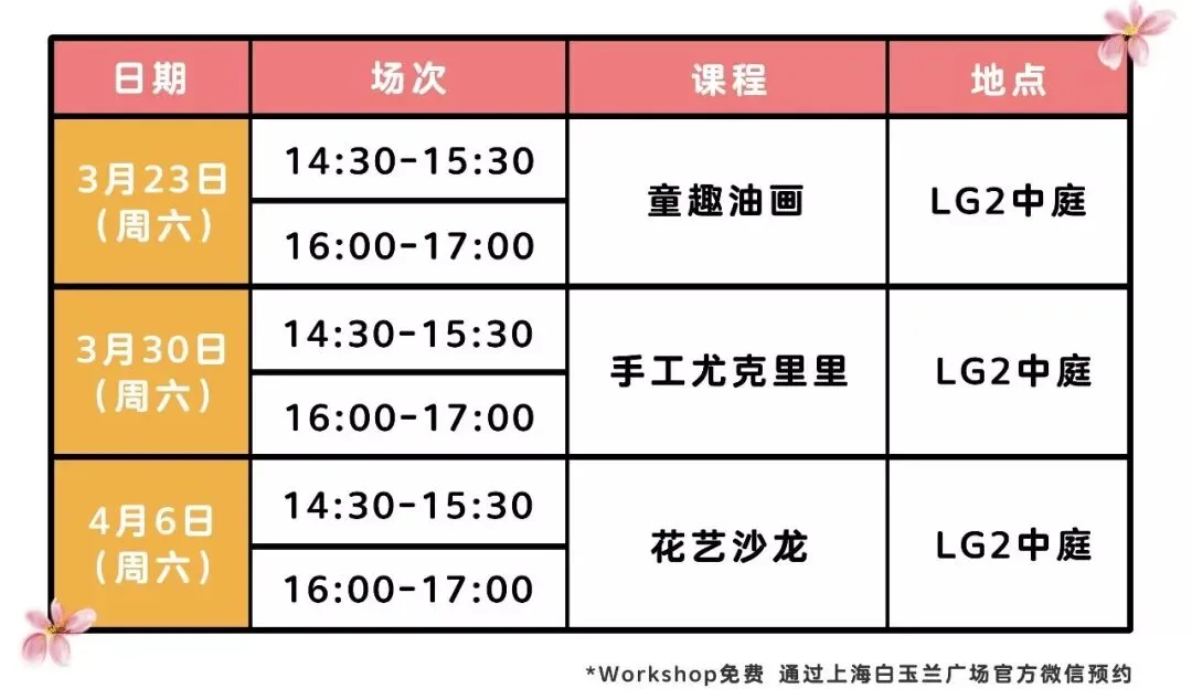 平时大家喜欢的手作课程,例如油画、DIY尤克里里、花艺沙龙,也全部安排在了连续三周周六的下午。只需要通过上海白玉兰广场官方微信(gh_edbacb86205c)就可以免费预约啦~