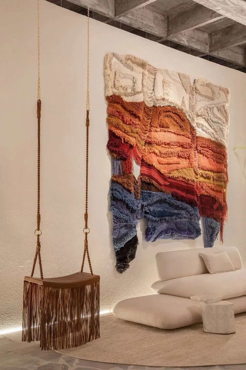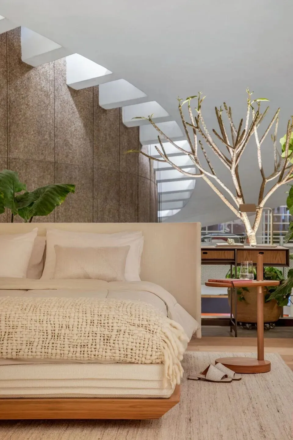 卧室墙上的作品 是芭芭拉与Bá Arte合作的装置艺术 ,通过天然石材和有机材质的连接,寓意生活中链接记忆的纽带。