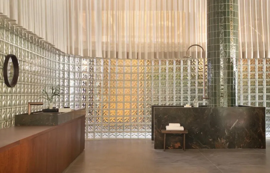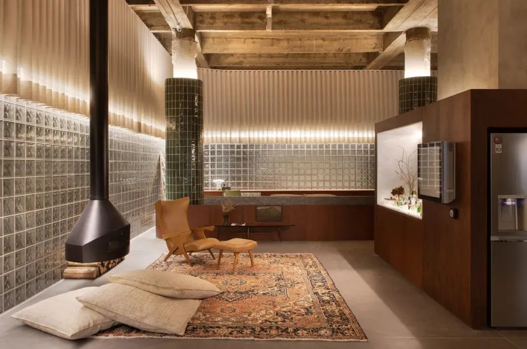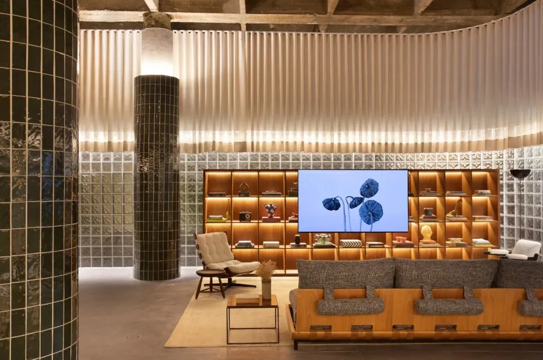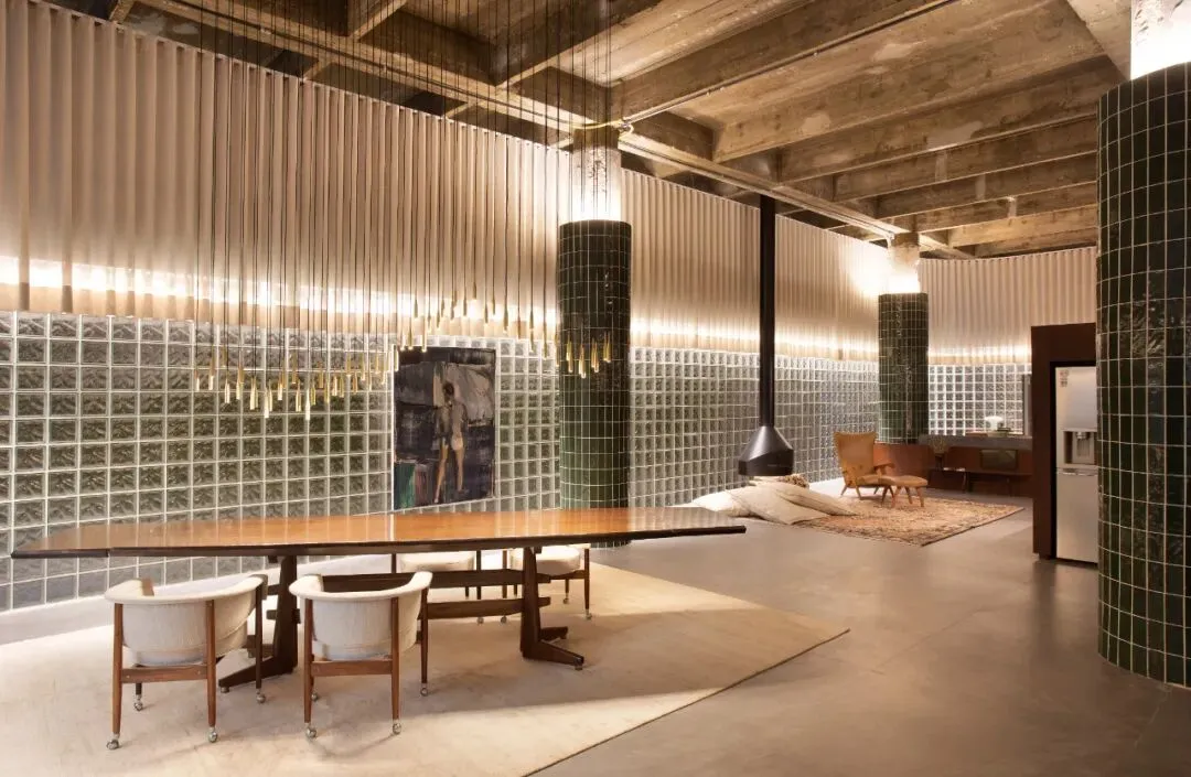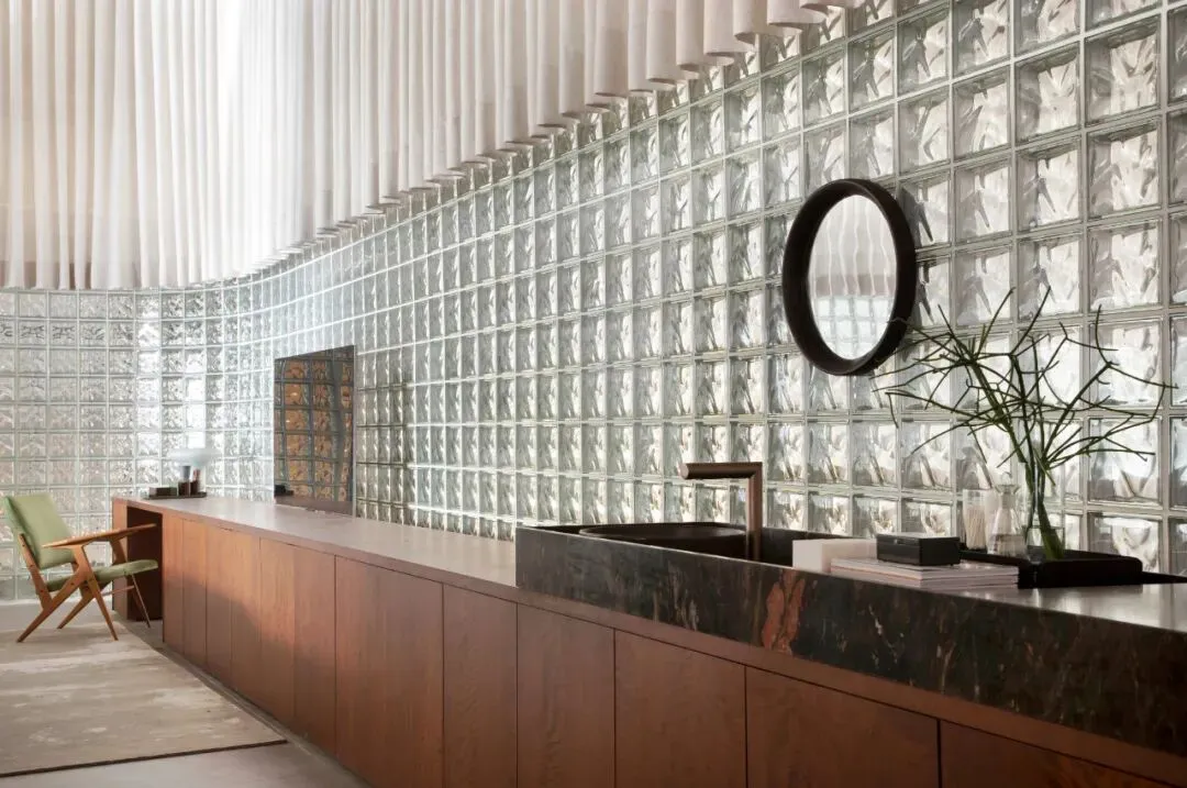 此外,玻璃砖材质与裸露的混凝土结构的碰撞,搭配经典的贴有搪瓷陶瓷的壁柱,充分展现了现代主义运动的空间氛围。