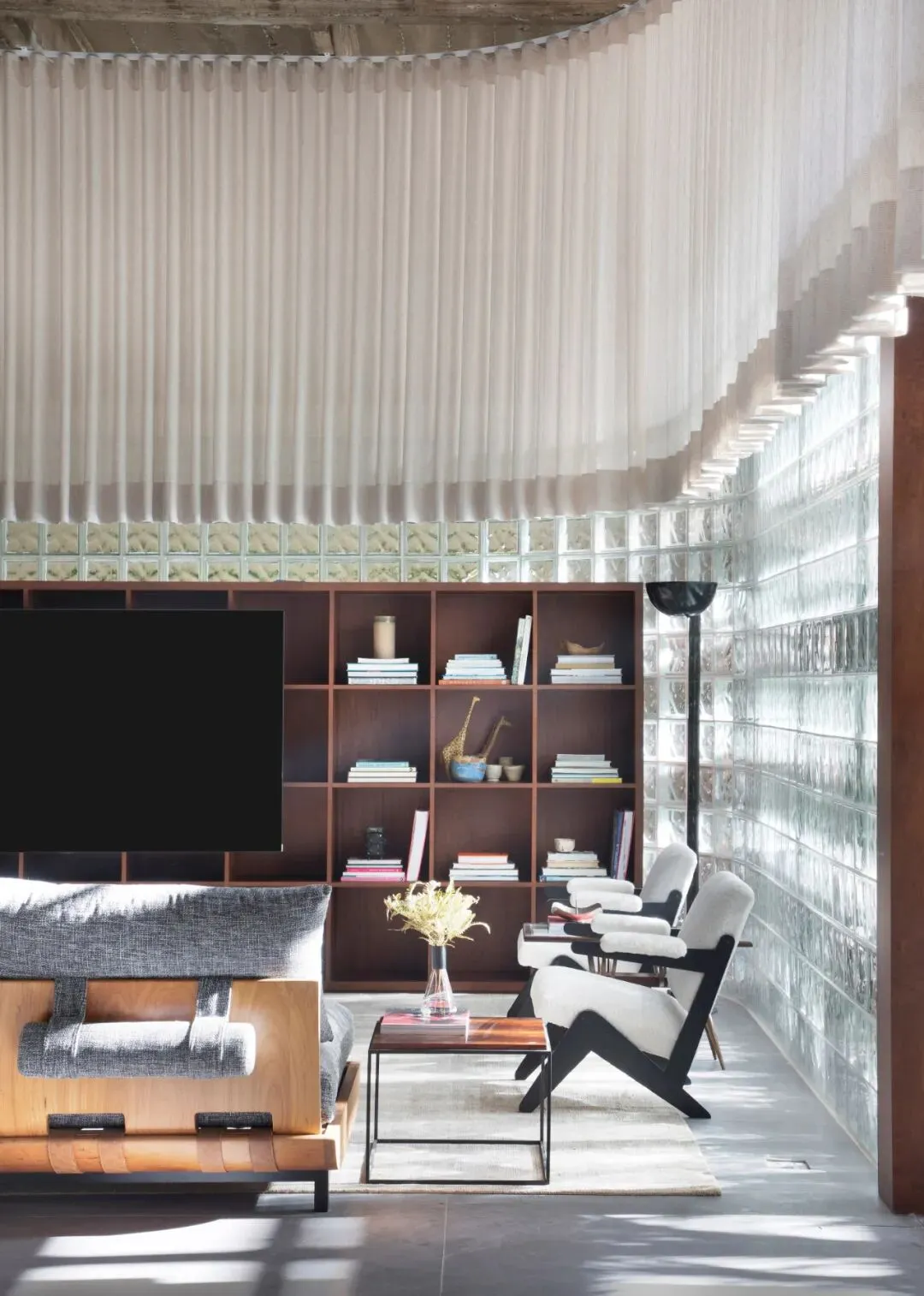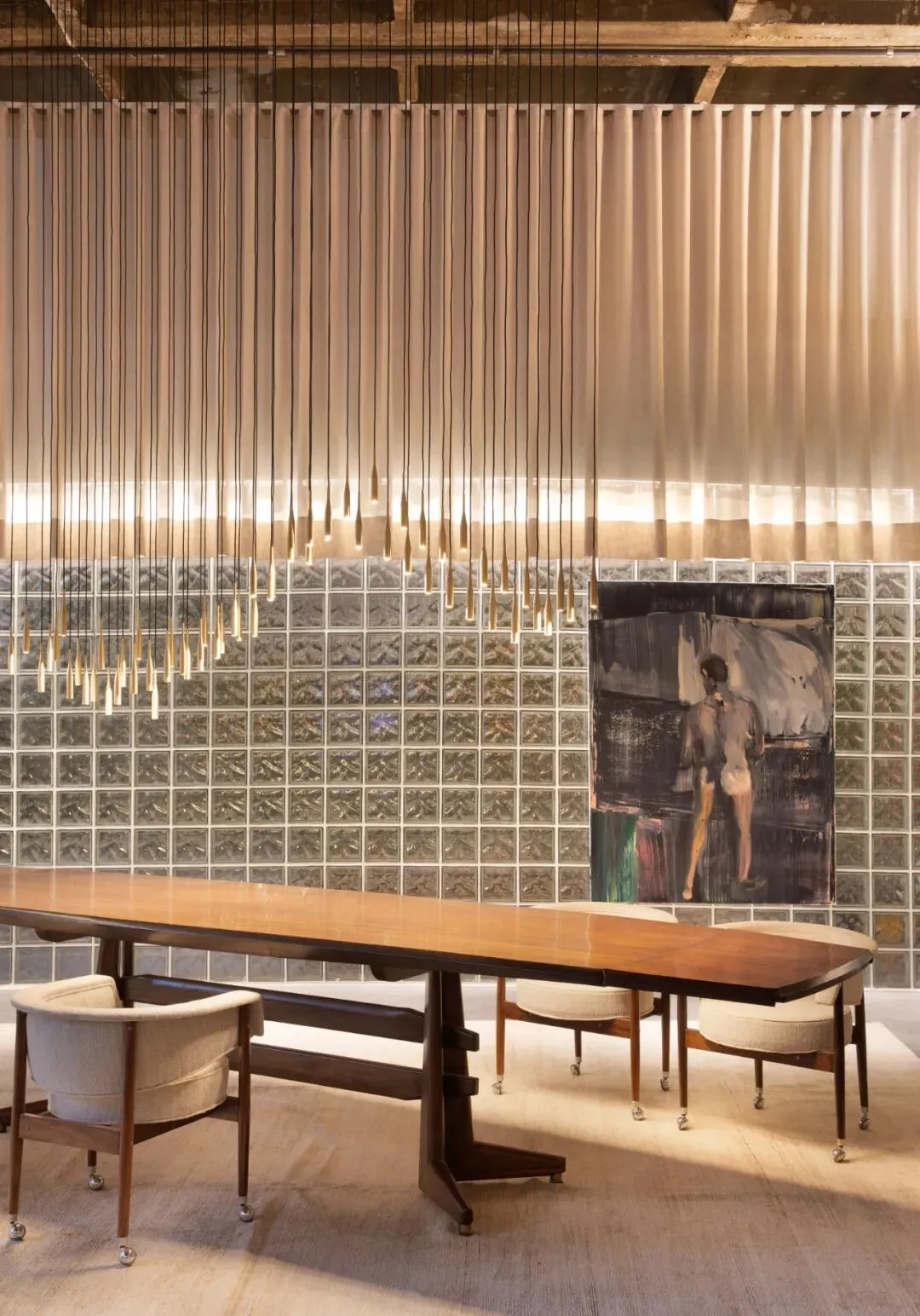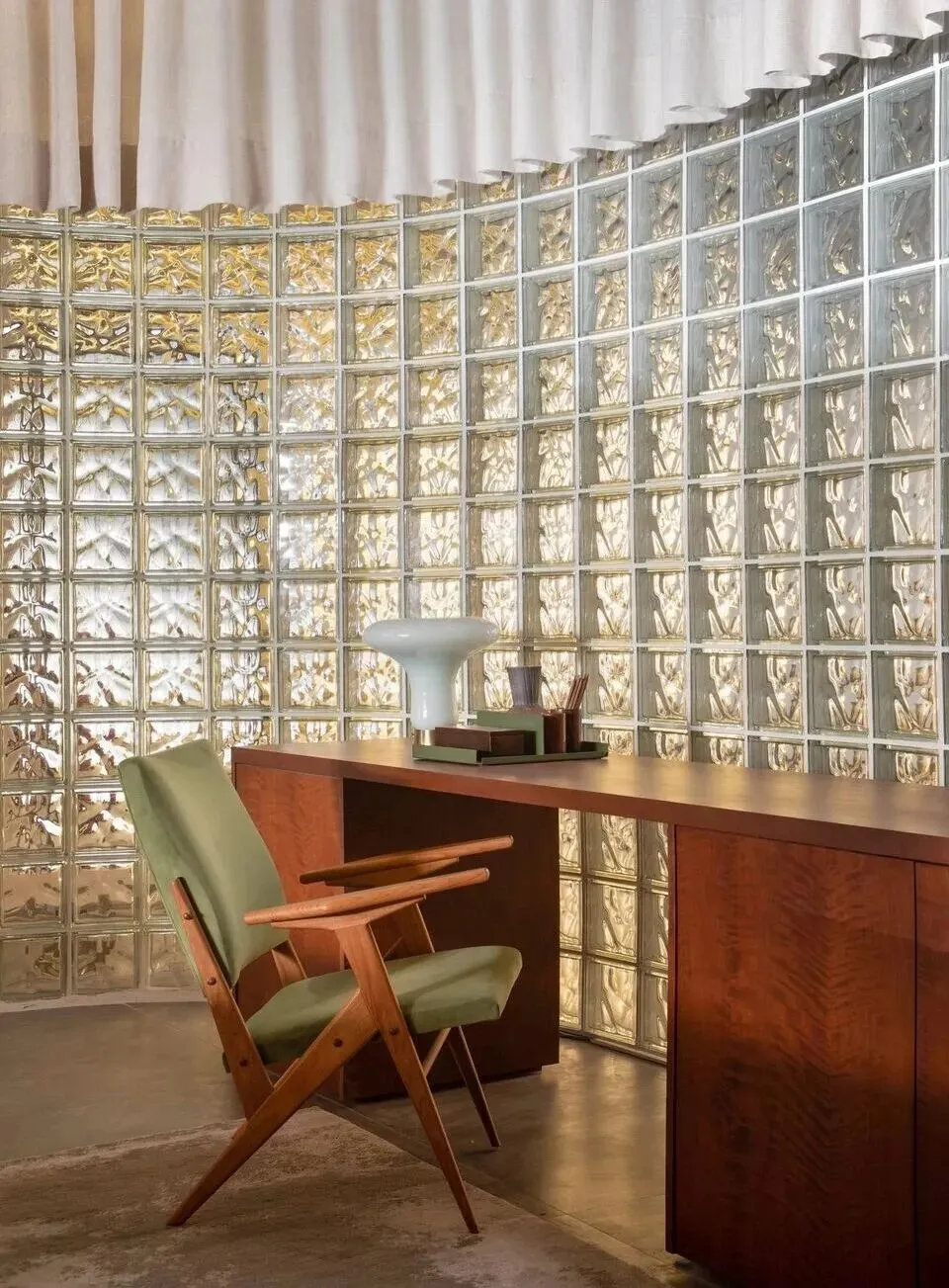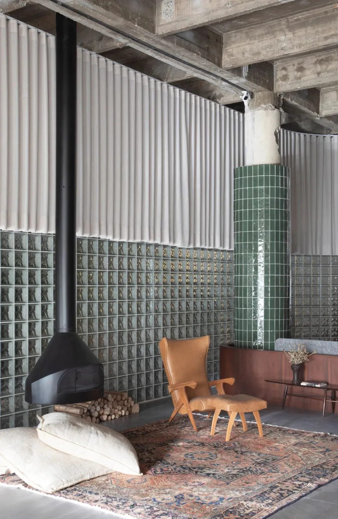 此外,玻璃砖材质与裸露的混凝土结构的碰撞,搭配经典的贴有搪瓷陶瓷的壁柱,充分展现了现代主义运动的空间氛围。