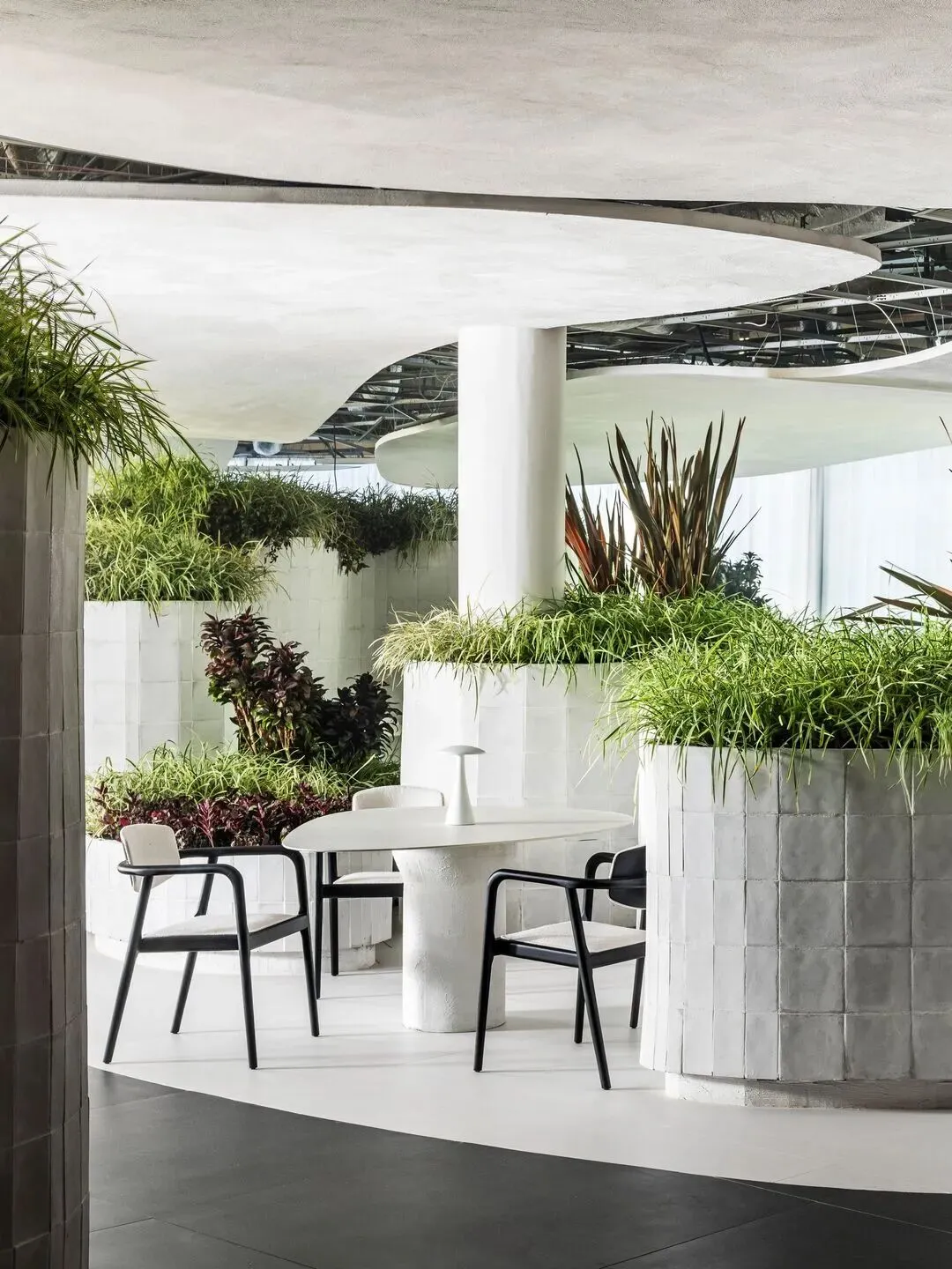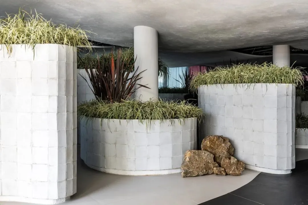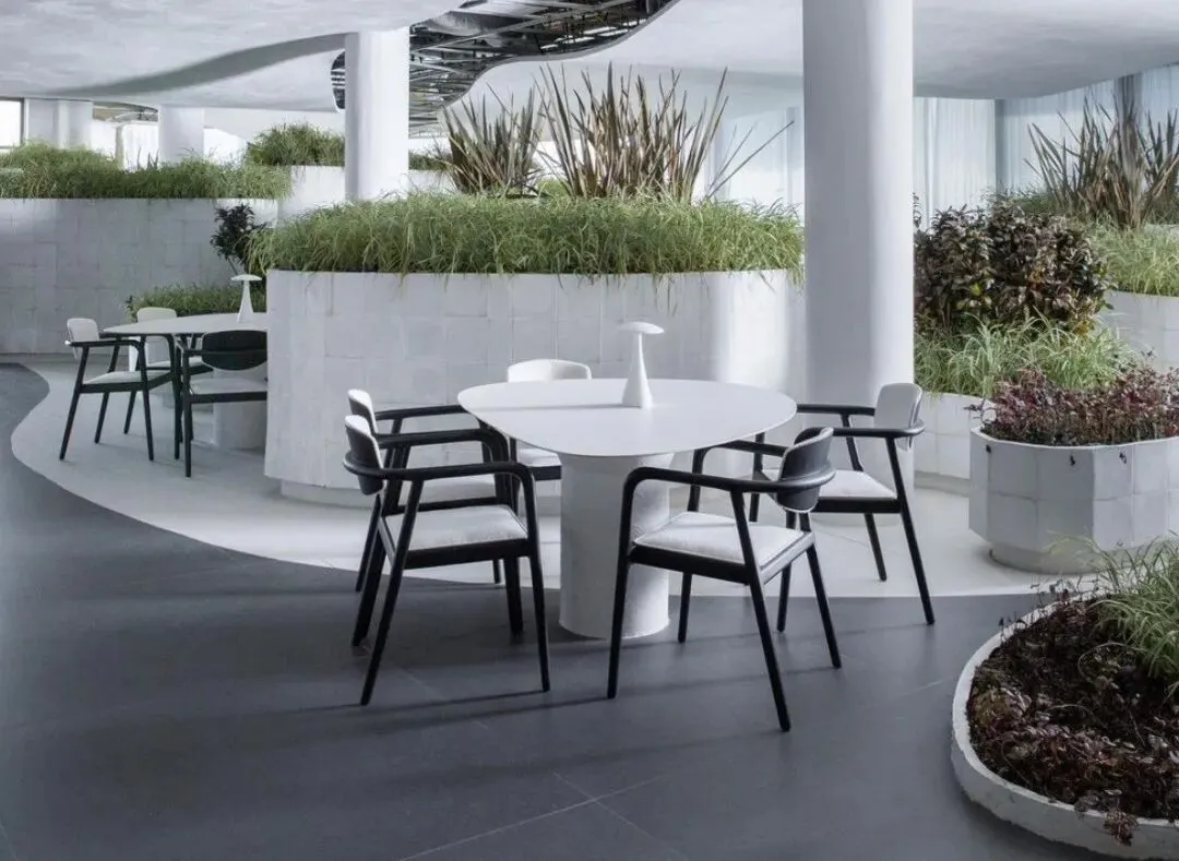 餐厅采用亲生物设计,餐厅被植物层层包围。 在这个占地 582平方米的大白色房间,游客可以自由探索不同功能的“岛屿”。 粘土是涂料原料的主要来源。 岛上以及地板和墙壁上大量使用褪色和老化的陶瓷,各种材料的纹理组合,隐喻地再现了空间随时间推移,历史的层次。