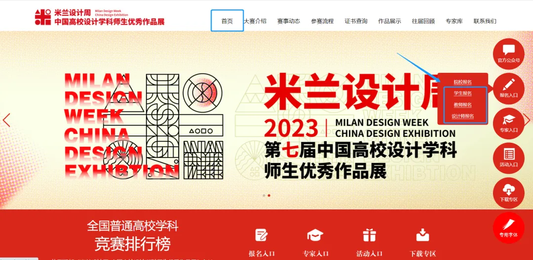 1.前往“米兰设计周-中国高校设计学科师生优秀作品展”大赛官网首页,在右侧浮窗中选择相应身份点击进入登录页面。(例如学生参赛,即点击【学生报名】入口)www.milan-aap.org.cn