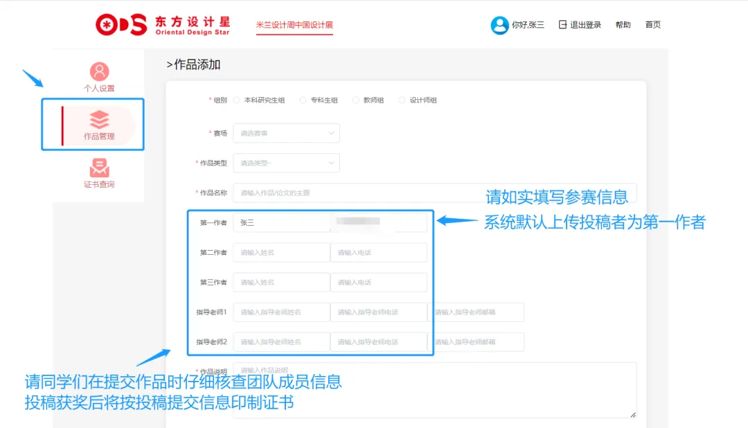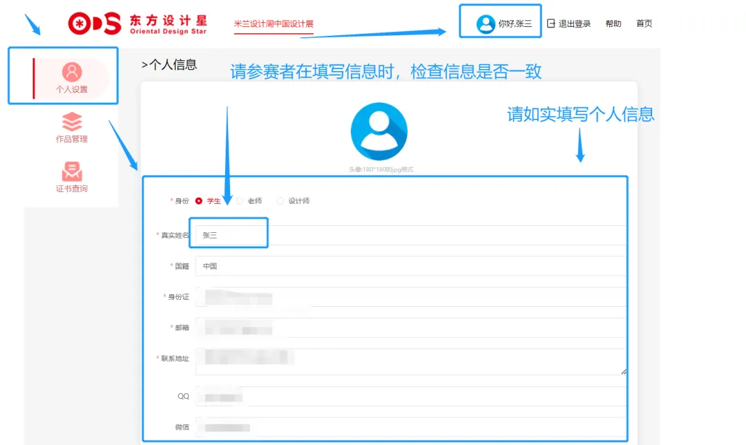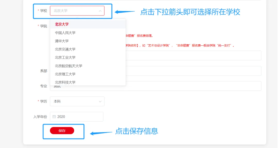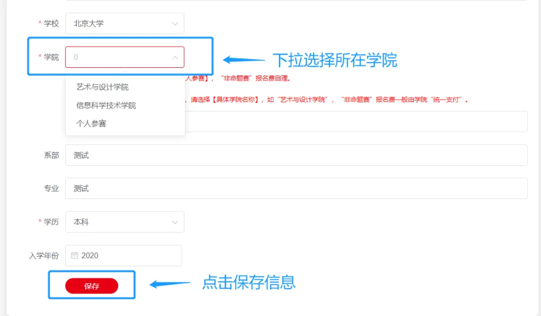 - 如院校信息填写错误,更改并保存信息后,需以最新信息,重新上传作品。(请务必填写正确信息)