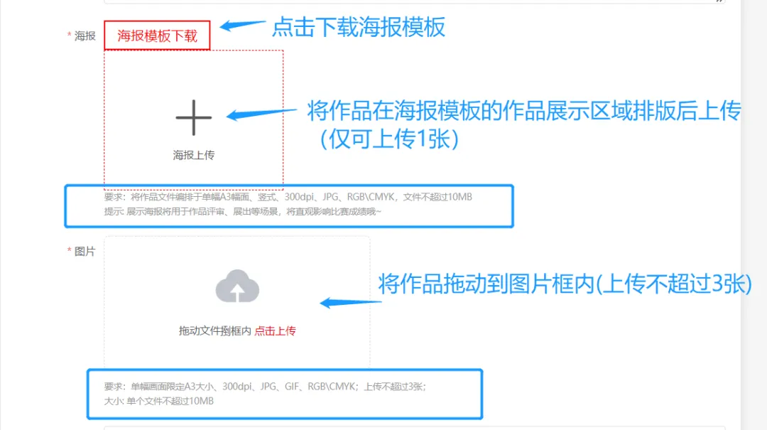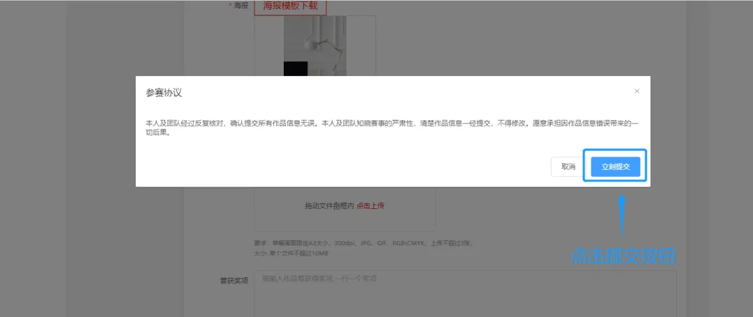 7、参赛者需下载海报模板并按要求排版后上传,展示海报将用于评审、展出场景,点击【保存】按钮,确认信息填写无误后,点击【立刻提交】按钮,即可提交作品。- 如提交【图片类】作品,需将作品拖动到图片文件框内。