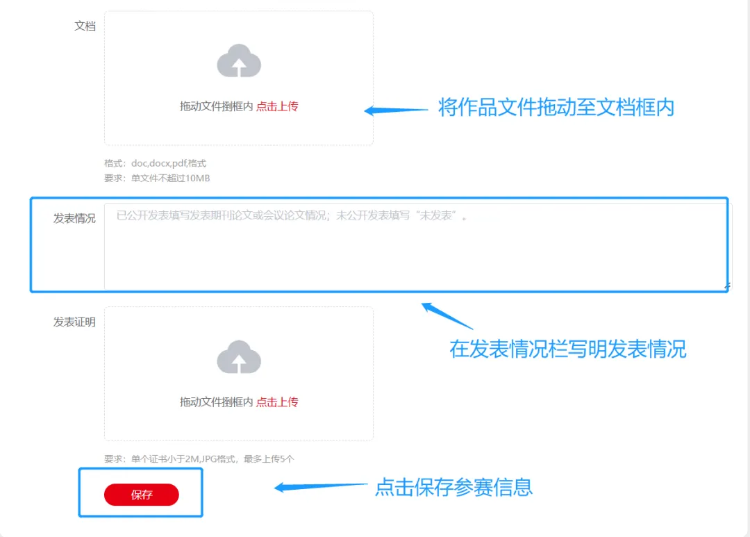 - 如提交【论文类】作品,需将作品文件拖动到文档框内。