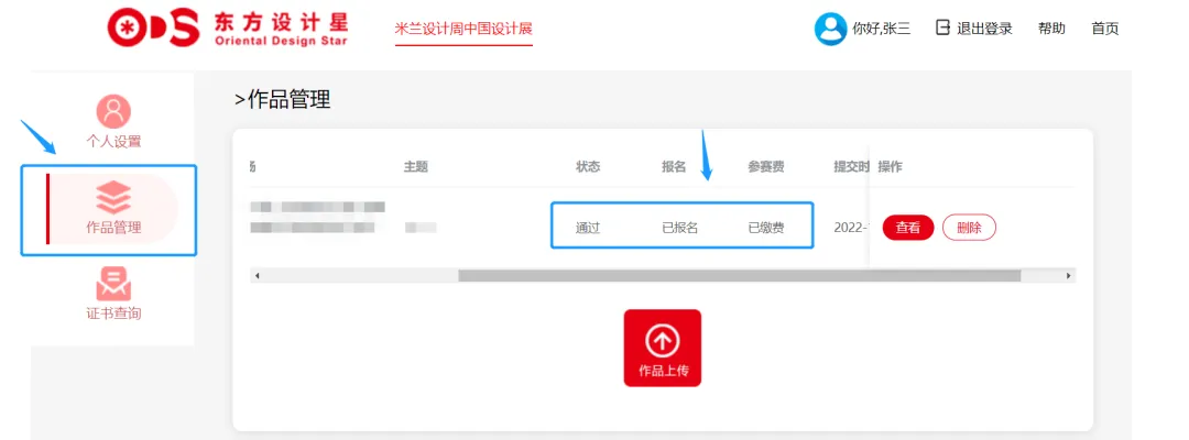 8、确认信息填写无误后,点击【立刻提交】按钮,即可提交作品。- 滑动作品栏底部灰色滑条,作品状态显示通过、已报名、已缴费即为报名成功。