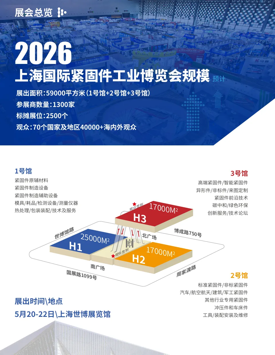 作为中国机械通用零部件工业协会紧固件分会(40 年行业权威)主办的专业展会,2026 上海国际紧固件工业博览会将于5 月 20-22 日登陆上海世博展览馆(国展路 1099 号),以5.9 万㎡展出面积、1300 家展商、2500 个标准展位的规模,打造全球紧固件产业核心交流平台。