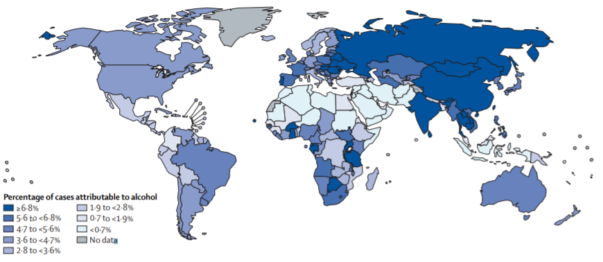 在这张“2020年全球酒精可归因癌症病例占比(男性)”图中,我国男性新发癌症病例中,与酒精相关的病例数占比,在世界范围内已经达到颜色最深的水平(≥6.8%)。