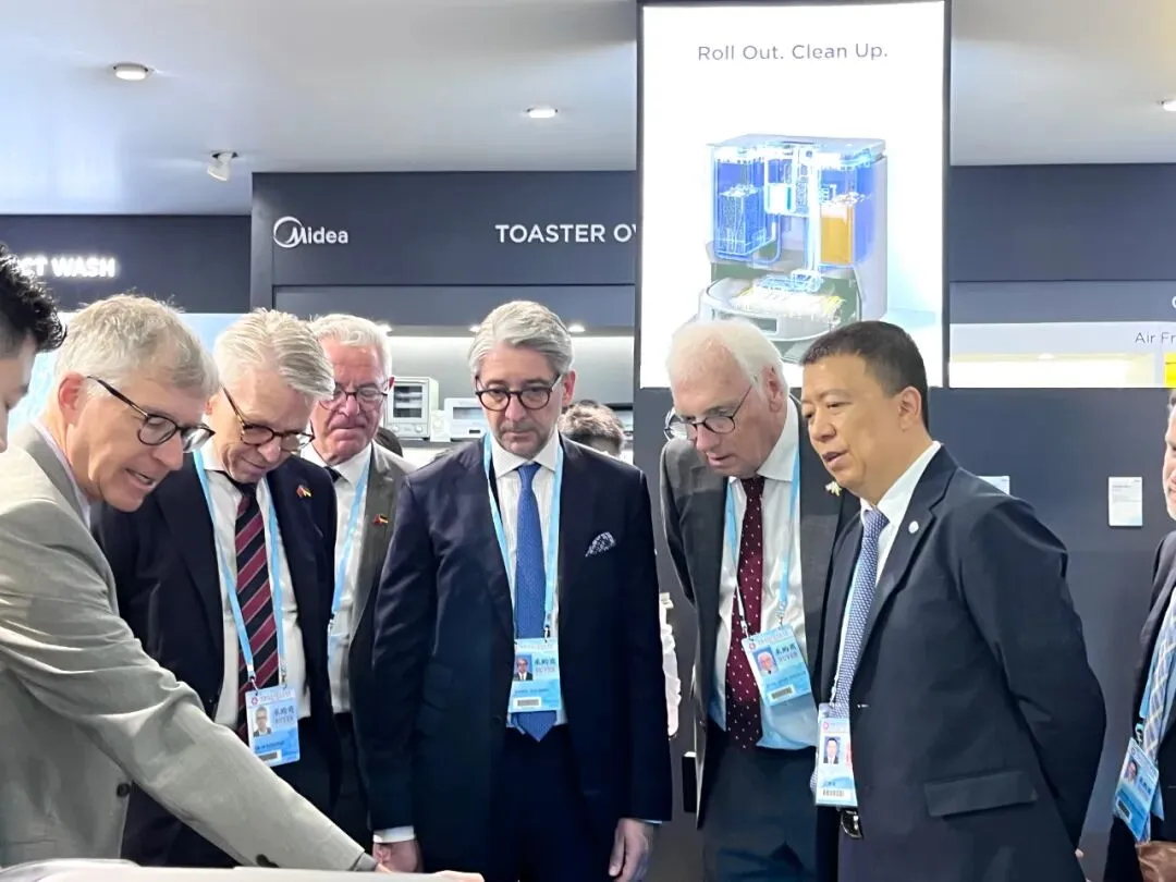 4月16日上午,佛山市市长白涛、副市长乔羽、市政府秘书长张开机、顺德区区长吕园园,副区长陈振浩一行来到美的展位,白涛市长表示,美的要继续发挥优势,把佛山家电出海做大做强。开展首日,联合国工业发展组织投资和技术促进办公室(简称UNIDO ITPO )也到访了美的展位参观,了解美的冰箱、吸尘器、炉灶一体等智能家居产品,更特别关注产品能效和绿色低碳信息。随团德国代表表示,中国智造的设计现代化,产品可靠实用,市场竞争力强。