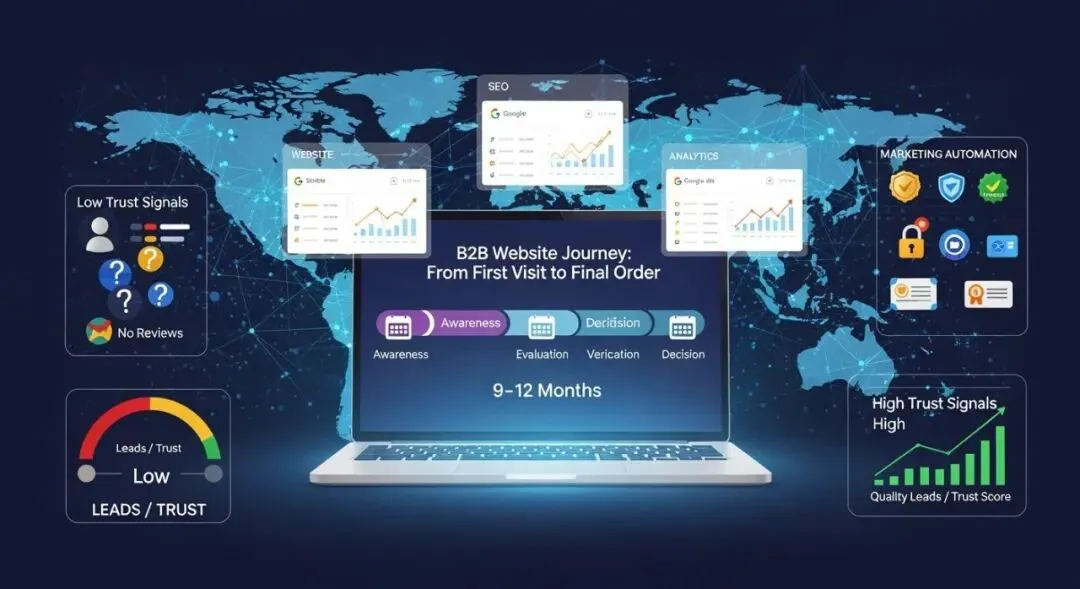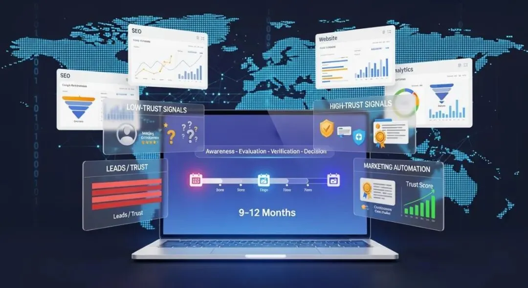 跨境B2B采购决策周期长达9-12个月,本质上是"信任成本"在作祟。地理距离让买家无法实地考察,文化差异让沟通存在天然障碍,品牌认知缺失让中国供应商很难快速建立信任感。当信任成本过高,采购方就会用更长的决策周期、更多的资料需求、更频繁的比价来降低风险,最终导致询盘转化率低、成交周期长、客户流失率高。