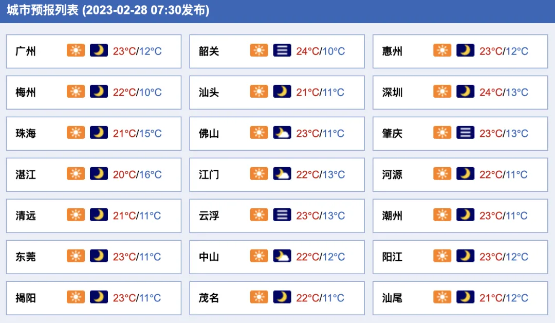 28日,全省大部晴到少云。早晨最低气温:粤北市县5~9℃,雷州半岛市县12~15℃,其余市县9~11℃。