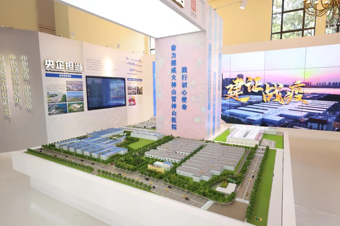 中国建筑展位设置“火雷精神”抗疫医院沙盘和“拓展幸福空间”中建幸福城沙盘2个重点展项,以及初心使命、央企担当、世界一流3个展区。